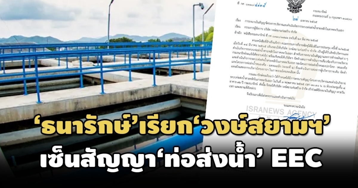 ‘ธนารักษ์’ ส่งหนังสือแจ้ง ‘วงษ์สยามก่อสร้าง’ ลงนามสัญญาบริหารท่อส่งน้ำดิบ EEC มูลค่า 2.5 หมื่นล้าน 3 พ.ค.นี้ พร้อมจ่ายเงินจ่ายก้อนแรก 743 ล้าน เผยวันรับมอบ ‘ท่อส่งน้ำ’ ต้องจ่ายอีก 870 ล้าน
