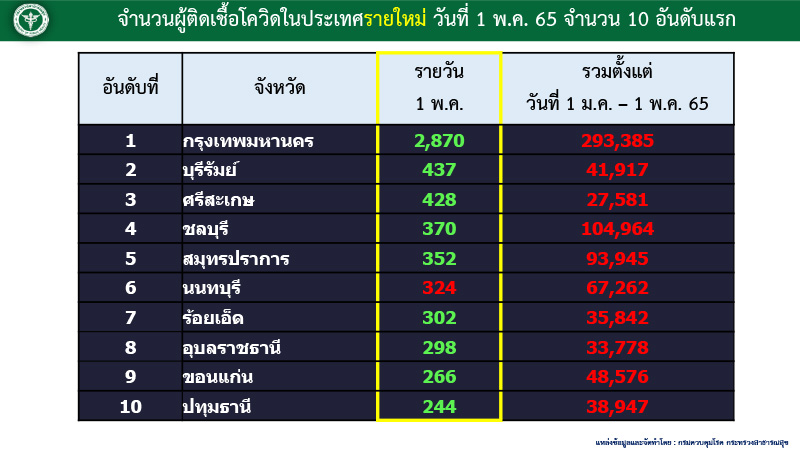 สำหรับ 10 จังหวัดที่มีผู้ติดเชื้อโควิดรายใหม่สูงสุด ตามลำดับ ได้แก่ กทม. 2,870 ราย บุรีรัมย์ 437 ราย ศรีสะเกษ 428 ราย ชลบุรี 370 ราย สมุทรปราการ 352 ราย นนทบุรี 324 ราย ร้อยเอ็ด 302 ราย อุบลราชธานี 298 ราย ขอนแก่น 266 ราย ปทุมธานี 244 ราย