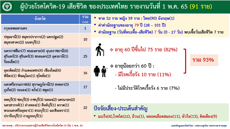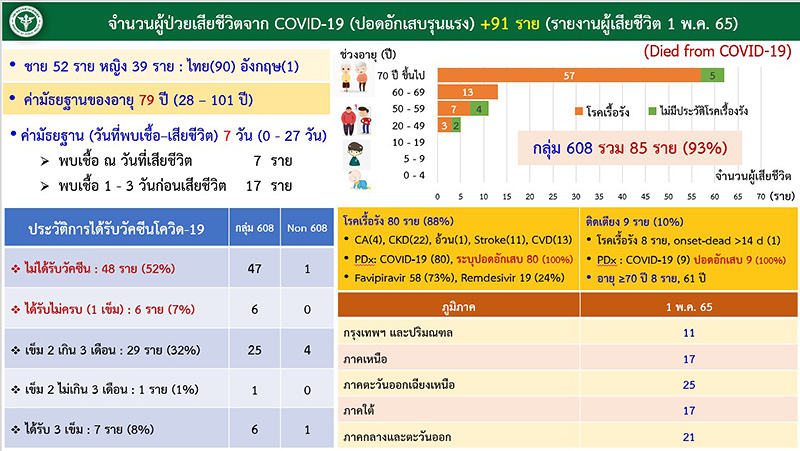 ด้านผู้เสียชีวิต 91 ราย มาจาก กทม. 1 ราย ปริมณฑล 10 ราย ภาคตะวันออกเฉียงเหนือ 25 ราย ภาคเหนือ 16 ราย ภาคใต้ 17 ราย และภาคกลาง 22 ราย แบ่งเป็นชาย 52 ราย หญิง 39 ราย อายุระหว่าง 28-101 ปี ค่ามัธญานวันที่พบเชื้อจนถึงวันที่เสียชีวิต 7 วัน และพบเชื้อวันเสียชีวิต 7 ราย
