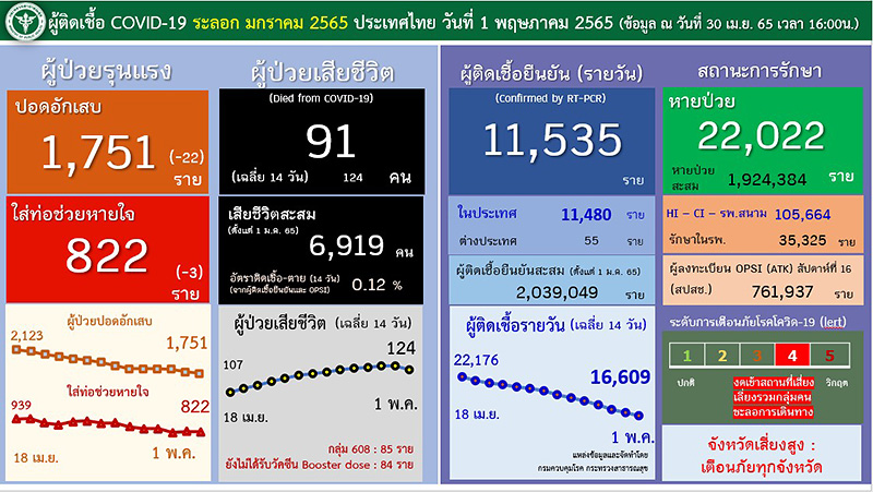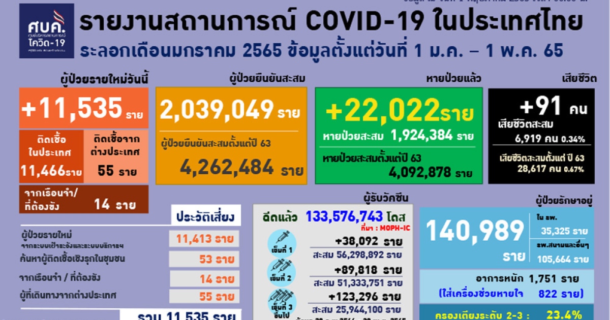อนึ่งเมื่อเวลา 08.00 น.สำนักข่าวอิศรา (www.isranews.org) รายงานสถานการณ์การติดเชื้อไวรัสโควิด-19 ประเทศไทย ประจำวันที่ 1 พฤษภาคม 2565 ว่า มีผู้ติดเชื้อใหม่ 11,535 ราย จำแนกเป็น