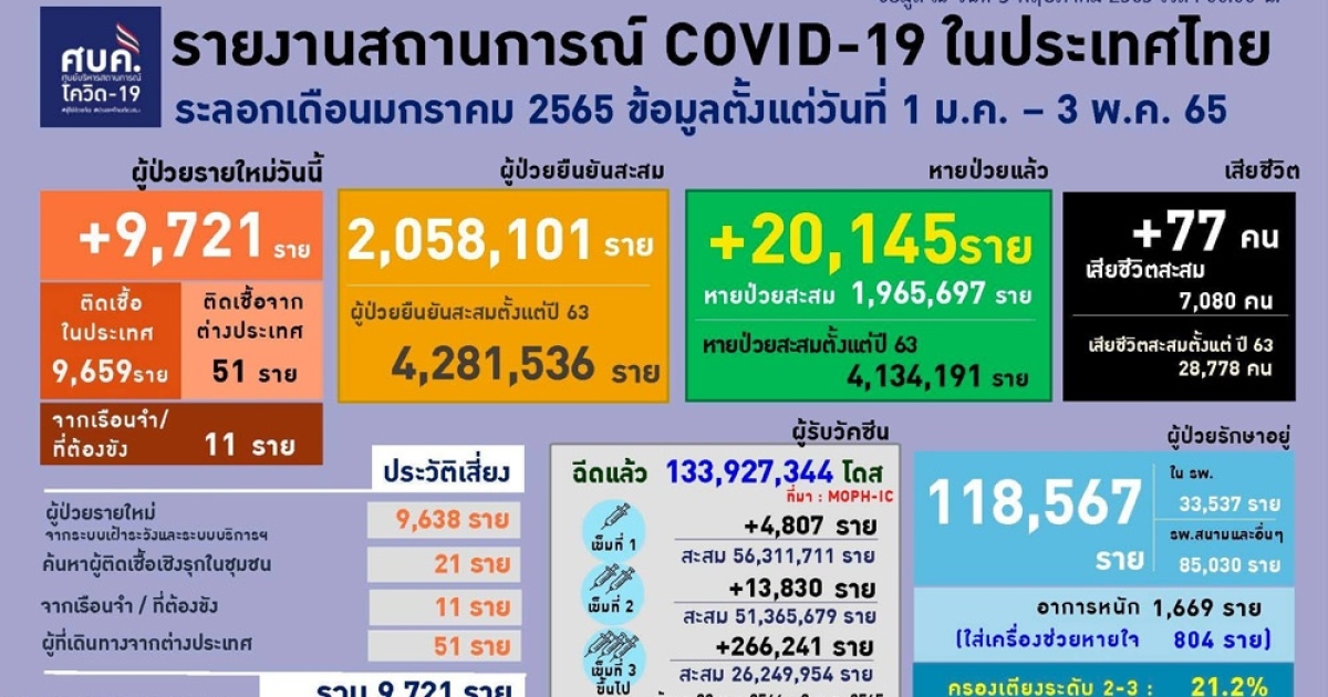 สำนักข่าวอิศรา (www.isranews.org) รายงานว่า เมื่อวันที่ 3 พ.ค. 2565 ศูนย์บริหารสถาการณ์โควิด-19 (ศบค.) รายงานสถานการณ์ประจำวัน โดยพบผู้ป่วยรายใหม่ 9,721 ราย จำแนกเป็น ติดเชื้อในประเทศ 9,670 ราย เกิดจากระบบเฝ้าระวังและระบบบริการฯ 9,638 ราย เกิดจากการค้นหาเชิงรุกและพบการติดเชื้อในชุมชน 21 ราย ติดเชื้อภายในเรือนจำ 11 ราย อีก 51 รายเดินทางกลับมาจากต่างประเทศ รวมผู้ป่วยสะสม 4,281,536 ราย