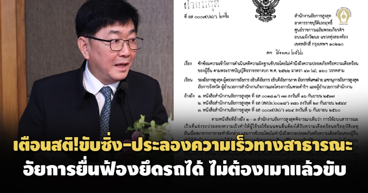 รองอธิบดีอัยการสำนักงานคดีศาลแขวง โชว์หนังสือเวียน อสส.เตือนสติขับรถไม่คำนึงถึงความปลอดภัย ใช้ถนนสาธารณะประลองความเร็ว ไม่ต้องมีข้อหาเมาแล้วขับ อัยการฟ้องยึดรถได้ ระบุคนทำผิดประเภทนี้มีมากขึ้น ไม่เกรงกลัวกฎหมาย