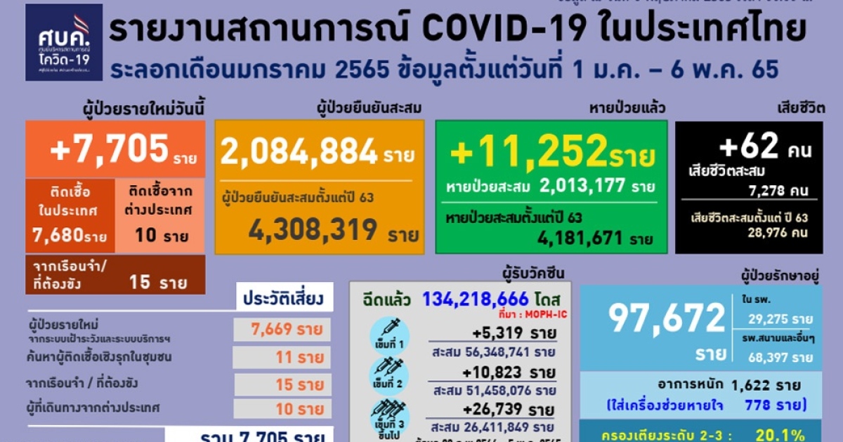 อนึ่งเมื่อเวลาประมาณ 08.00 น. สำนักข่าวอิศรา รายงานสถานการณ์การติดเชื้อไวรัสโควิด-19 ประเทศไทย ประจำวันที่ 6 พฤษภาคม 2565 ว่า มีผู้ติดเชื้อใหม่ 7,705 ราย