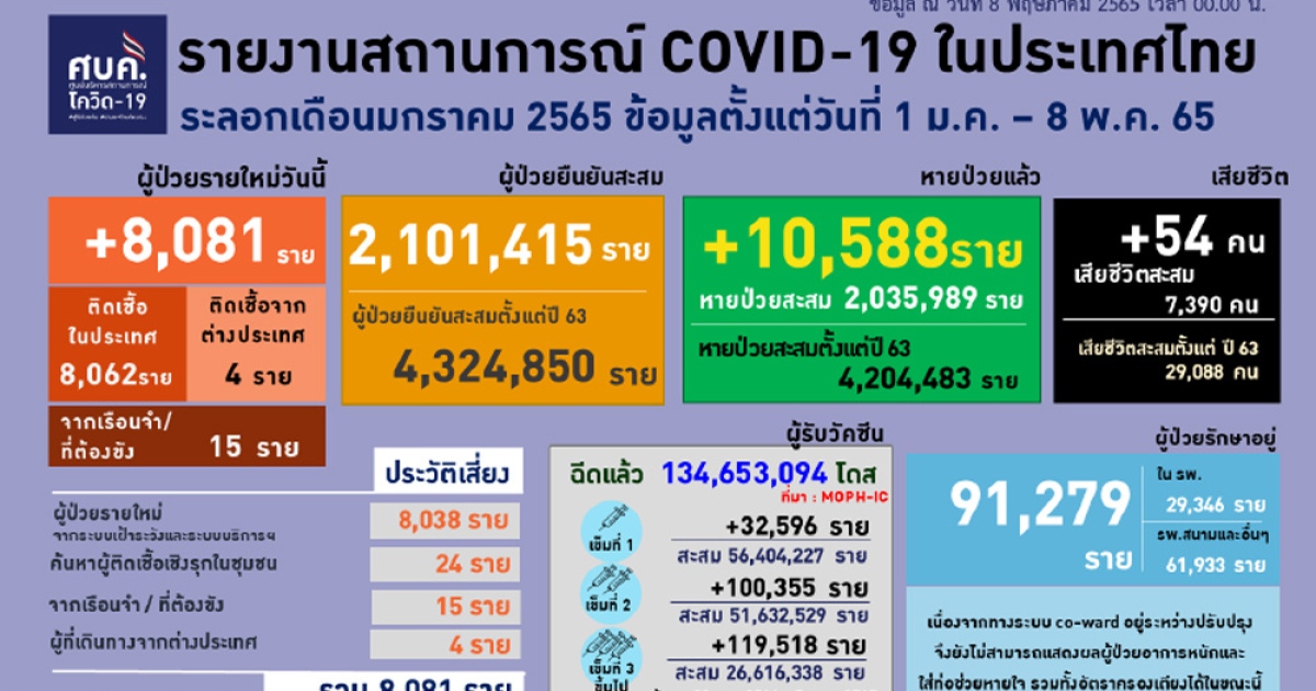 โควิดวันนี้ ป่วยเพิ่ม 8,081 ตาย 54 หายดี 10,588 ยังอยู่ระหว่างรักษา 91,279 ราย