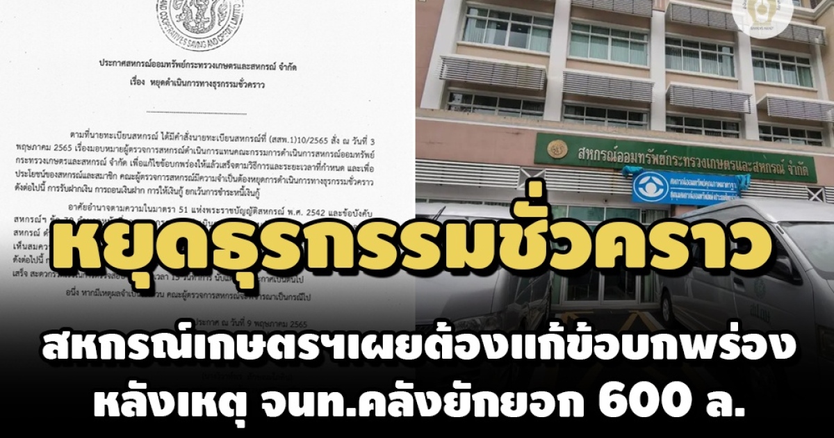 'สหกรณ์กระทรวงเกษตรฯ' ออกประกาศหยุดธุรกรรมชั่วคราว เผยต้องแก้ไขข้อบกพร่อง หลังเหตุ หัวหน้าฝ่ายการเงินยักยอก 600 ล้านบาท