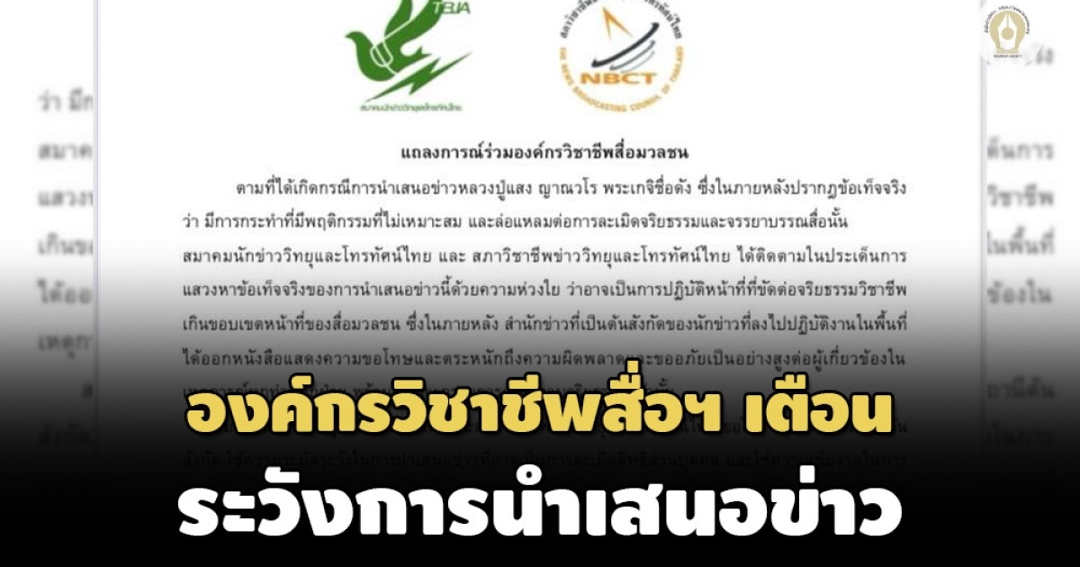 ผู้สื่อข่าวรายงานว่า เมื่อวันที่ 13 พ.ค. 2565 สภาวิชาชีพข่าววิทยุและโทรทัศน์ไทย สมาคมนักข่าววิทยุและโทรทัศน์ไทย ออกแถลงการณ์ร่วมองค์กรวิชาชีพสื่อมวลชน ระบุว่า ตามที่ได้เกิดกรณีการนำเสนอข่าวหลวงปู่แสง ญาณวโร พระเกจิชื่อดัง ซึ่งในภายหลังปรากฎข้อเท็จจริงว่า มีการกระทำที่มีพฤติกรรมที่ไม่เหมาะสม และล่อแหลมต่อการละเมิดจริยธรรมและจรรยาบรรณสื่อนั้น