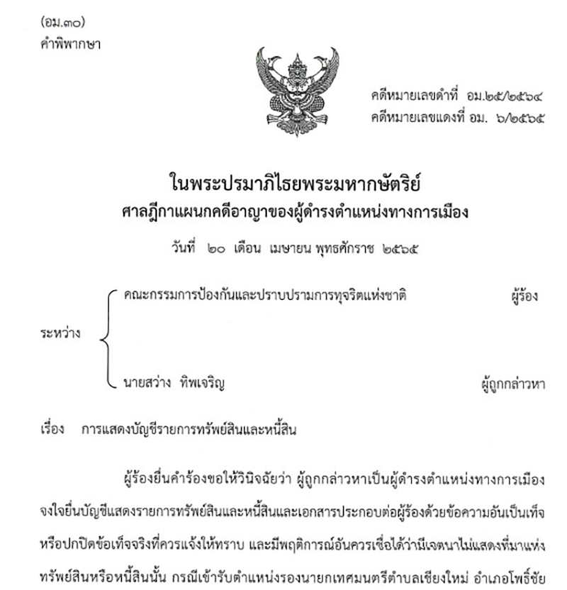 พิพากษาว่า นายสว่าง ทิพเจริญ ผู้ถูกกล่าวหาจงใจยื่นบัญชีแสดงรายการทรัพย์สินและหนี้สินและเอกสารประกอบต่อคณะกรรมการป้องกันและปราบปรามการทุจริตแห่งชาติ ด้วยข้อความอันเป็นเท็จหรือปกปิดข้อเท็จจริงที่ควรแจ้งให้ทราบ กรณีเข้ารับตําแหน่ง รองนายกเทศมนตรีตําบลเชียงใหม่ อําเภอโพธิ์ชัย จังหวัดร้อยเอ็ด ตามพระราชบัญญัติประกอบ รัฐธรรมนูญว่าด้วยการป้องกันและปราบปรามการทุจริต พ.ศ. 2542 มาตรา 32 และมาตรา 33 ประกอบพระราชบัญญัติประกอบรัฐธรรมนูญว่าด้วยการป้องกันและปราบปรามการทุจริต พ.ศ. 2561 มาตรา 114 วรรคหนึ่ง ห้ามมิให้ผู้ถูกกล่าวหาดํารงตําแหน่งทางการเมืองหรือดํารงตําแหน่ง ใดในพรรคการเมืองเป็นเวลาห้าปีนับแต่วันที่ 1 กุมภาพันธ์ 2564 ซึ่งเป็นวันที่พ้นจากตําแหน่งตาม พระราชบัญญัติประกอบรัฐธรรมนูญว่าด้วยการป้องกันและปราบปรามการทุจริต พ.ศ. 2542มาตรา 34 วรรคสอง กับมีความผิดตามพระราชบัญญัติประกอบรัฐธรรมนูญว่าด้วยการป้องกันและปราบปรามการทุจริต พ.ศ. 2542 มาตรา 119 จําคุก 2 เดือน และปรับ 8,000 บาท ผู้ถูกกล่าวหาให้การรับสารภาพ เป็นประโยชน์แก่การพิจารณา มีเหตุบรรเทาโทษ ลดโทษให้กึ่งหนึ่ง ตามประมวลกฎหมายอาญา มาตรา 78 คงจําคุก 1 เดือน และปรับ 4,000 บาท ไม่ปรากฏว่า ผู้ถูกกล่าวหาเคยได้รับโทษจําคุกมาก่อน โทษจําคุกจึงให้รอการลงโทษไว้ มีกําหนด 1 ปี ตามประมวล กฎหมายอาญา มาตรา 56 ไม่ชําระค่าปรับให้จัดการตามประมวลกฎหมายอาญา มาตรา 29, 30. (คำพิพากษา คดีหมายเลขแดงที่ อม .6/2565)