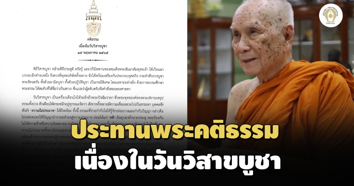 ผู้สื่อข่าวรายงานว่า สำนักงานเลขานุการสมเด็จพระสังฆราช เปิดเผยว่า เนื่องในวันวิสาขบูชา 15 พ.ค.2565 เจ้าพระคุณ สมเด็จพระอริยวงศาคตญาณ สมเด็จพระสังฆราช สกลมหาสังฆปริณายก ประทานพระคติธรรม ความว่า