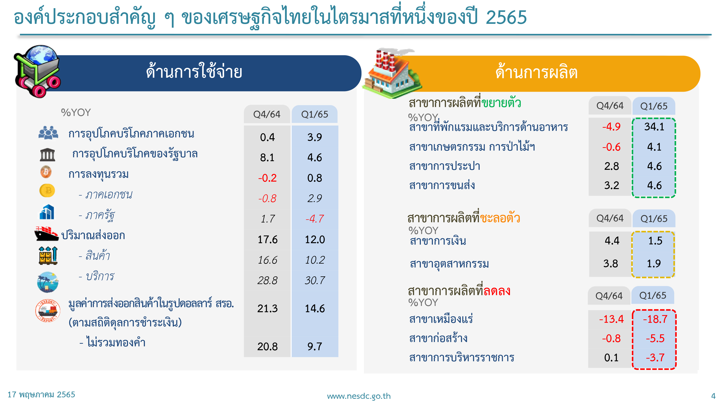 ทั้งนี้ ในช่วงไตรมาส 1/2565 การส่งออกสินค้าไทยขยายตัว 14.6% เมื่อเทียบกับช่วงเดียวกันของปีก่อน ,การส่งออกบริการขยายตัว 30.7% ,สาขาที่พักแรมและบริการด้านอาหารขยายตัว 34.1% อย่างไรก็ตาม แม้ว่าการลงทุนรวมจะขยายตัวได้ 0.8% แต่จะพบว่าการลงทุนภาครัฐหดตัว -4.7% ในขณะที่การลงทุนเอกชนขยายตัว 2.9% ส่วนสาขาก่อสร้างหดตัว -5.5% และพบว่าในสาขาการผลิตที่สำคัญ โดยเฉพาะภาคอุตสาหกรรมเริ่มเห็นสัญญาณการชะลอตัว