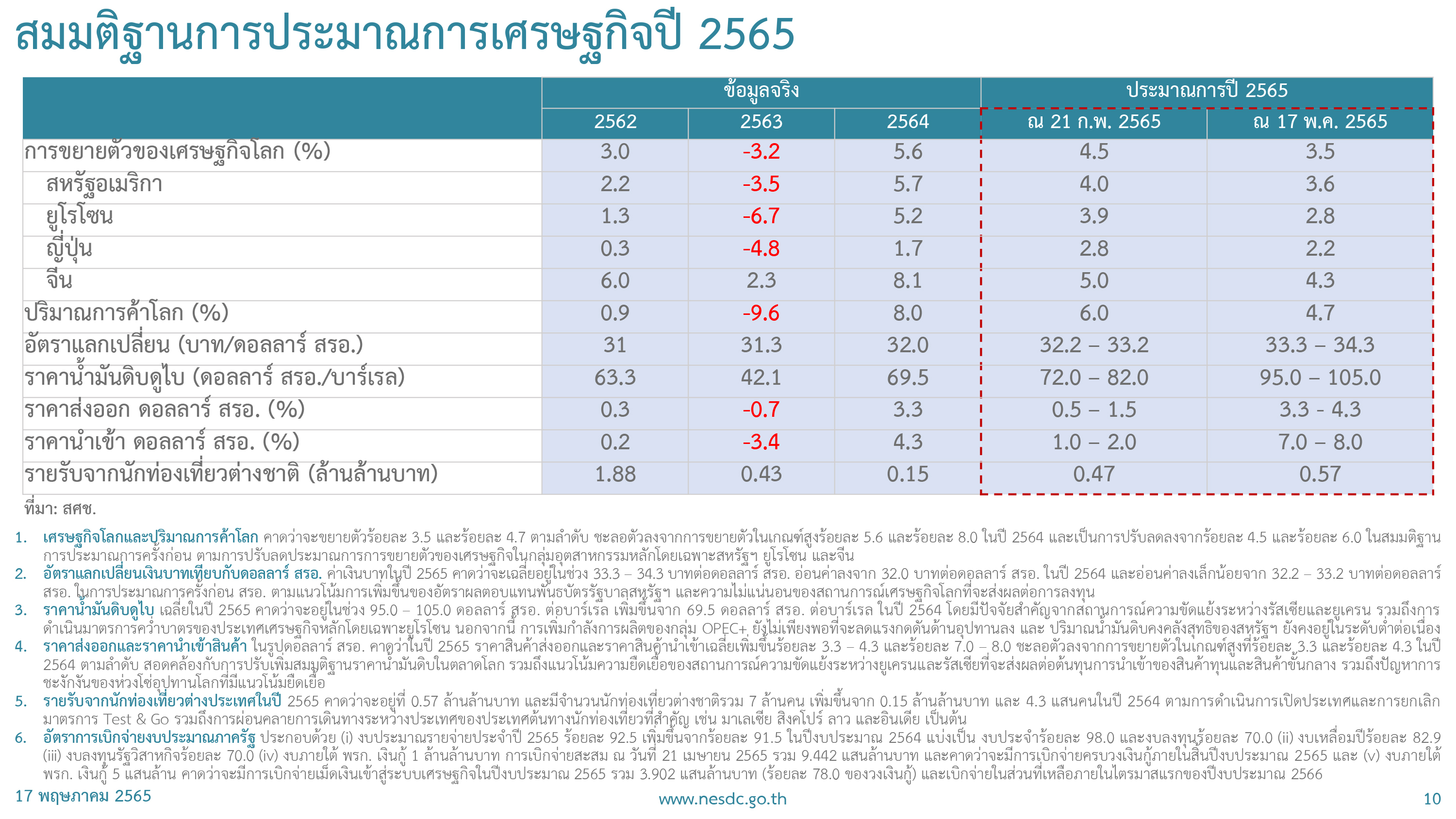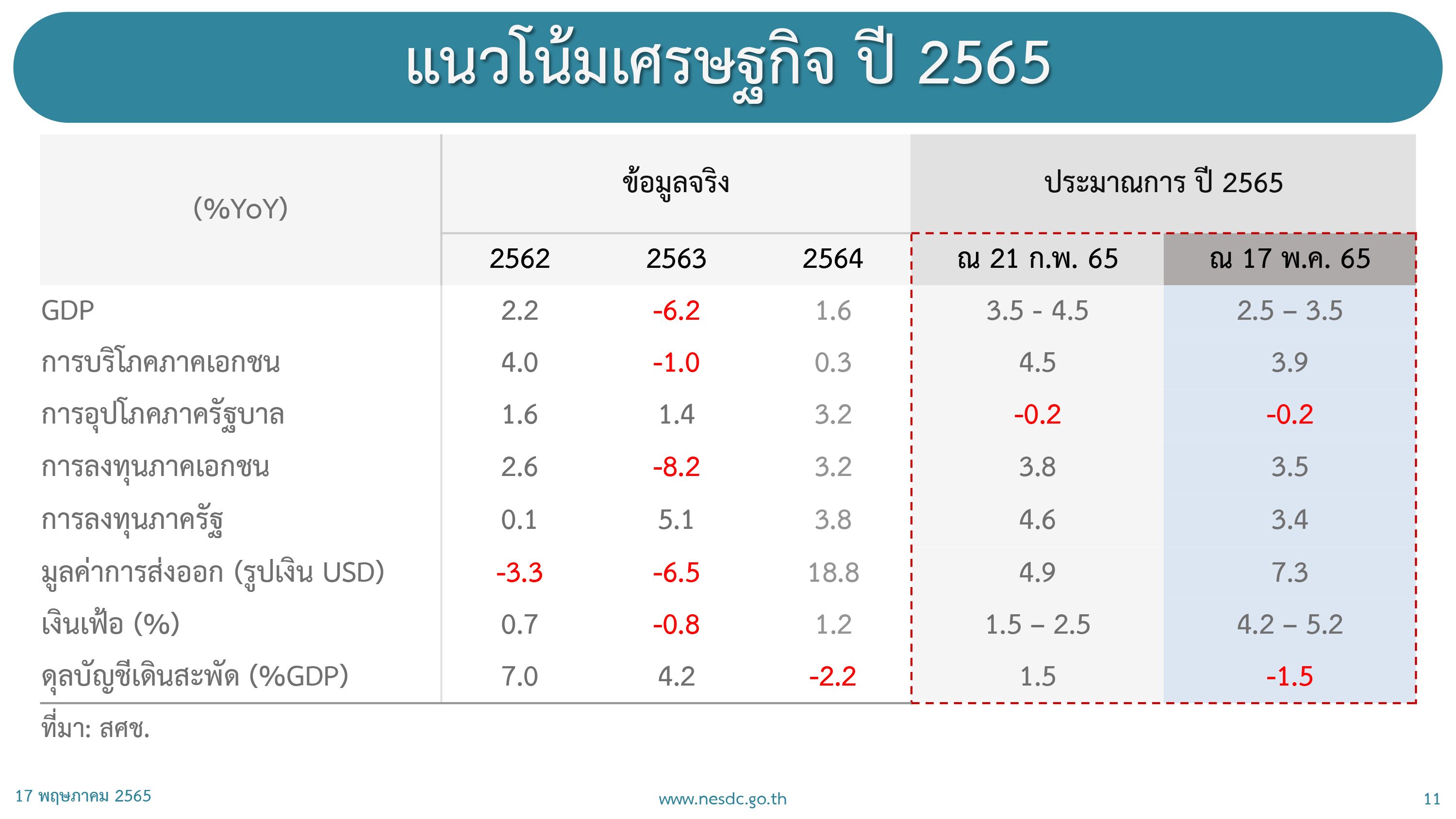 โดย สศช.คาดว่า การส่งออกไทยในปี 2565 จะขยายตัวที่ 7.2% จากเดิมที่คาดว่าจะขยายตัว 4.9% ,การบริโภคภาคเอกชนขยายตัว 3.9% จากเดิมที่คาดว่าจะขยายตัว 4.5% ,การลงทุนภาคเอกชนขยายตัว 3.5% จากเดิมที่คาดว่าจะขยายตัว 3.8% ,การลงทุนภาครัฐขยายตัว 3.4% จากเดิมที่คาดว่าจะขยายตัว 4.6% ,อัตราเงินเฟ้อทั่วไปขยายตัว 4.2-5.2% จากเดิมที่คาดว่าจะขยายตัว 1.5-2.5% และดุลบัญชีเดินสะพัดติดลบ 1.5% ของจีดีพี