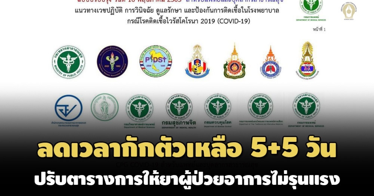 กรมการแพทย์ เผยแพร่แนวทางเวชปฏิบัติ การวินิจฉัย ดูแลรักษา และป้องกันการติดเชื้อในโรงพยาบาล กรณีโควิด-19 ฉบับใหม่ ลดจำนวนวันกักตัวเหลือ 5+5 วัน- ปรับตารางการให้ยาต้านไวรัสในผู้ป่วยที่ไม่มีอาการรุนแรง