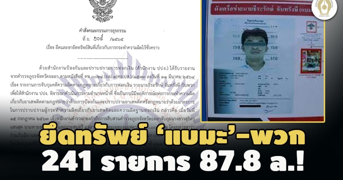 ปปง.สั่งยึดอายัดทรัพย์สิน ‘ธีระรักษ์ จันทรังษี-แบมะ’ กับพวก 241 รายการ 87.8 ล้าน พฤติการณ์ค้ายาเสพติด ฟอกเงิน หลังรับรายงานจาก ตร.ภูธรจังหวัดยะลาชุดจับกุม เงินสด ทองรูปพรรณ เครื่องประดับ กระเป๋าหนัง พระเลี่ยมทอง เครื่องปั้มน้ำ เครื่องปั่นไฟ เครื่องปั้มลม เครื่องพ่นยา ให้ผู้ครอบครองยื่นเพิกถอนคําสั่งภายใน 30 วัน