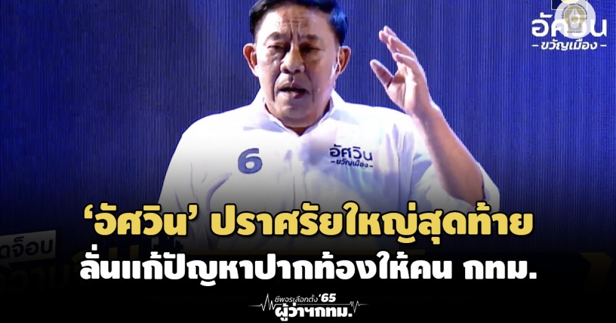 'อัศวิน' ขึ้นเวทีปราศรัยใหญ่สุดท้าย ณ อินดอร์ สเตเดี้ยม หัวหมาก ลั่น 'ปิดจ็อบความจน' ลุยแก้ปัญหาปากท้องให้คนกรุงเทพฯ มี 'ถาวร' อดีต แกนนำ กปปส.ร่วมขึ้นเวทีสนับสนุน