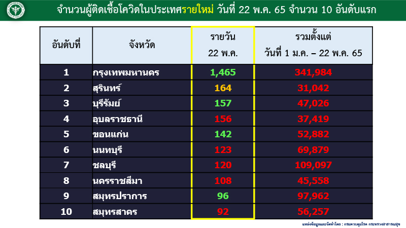 สำหรับ 10 จังหวัดที่มีผู้ติดเชื้อโควิดรายใหม่สูงสุด ตามลำดับ ได้แก่ กทม. 1,465 ราย สุรินทร์ 164 ราย บุรีรัมย์ 157 ราย อุบลราชธานี 156 ราย ขอนแก่น 142 ราย นนทบุรี 123 ราย ชลบุรี 120 ราย นครราชสีมา 108 ราย สมุทรปราการ 96 ราย สมุทรสาคร 92 ราย