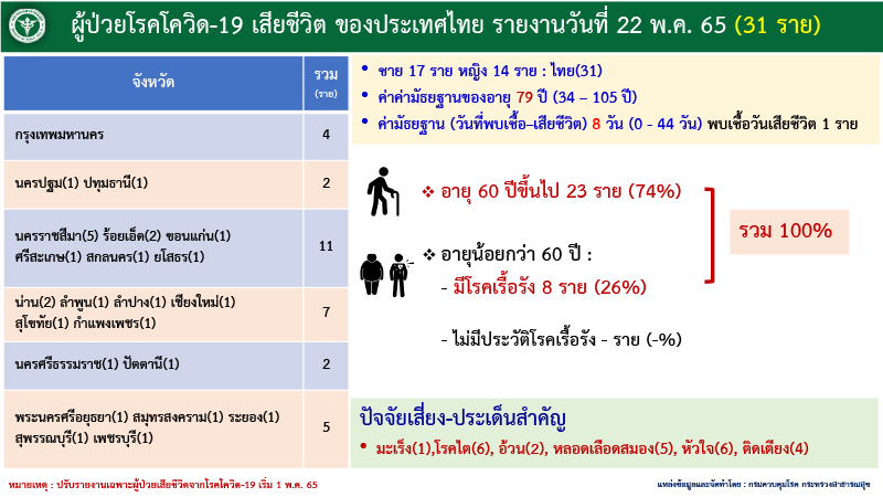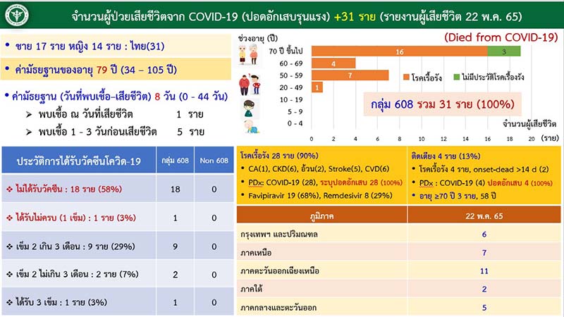 ด้านผู้เสียชีวิต 31 ราย มาจาก กทม. 4 ราย ปริมณฑล 2 ราย ภาคตะวันออกเฉียงเหนือ 11 ราย ภาคเหนือ 7 ราย ภาคใต้ 2 ราย และภาคกลาง 5 ราย แบ่งเป็นชาย 17 ราย หญิง 14 ราย เป็นกลุ่ม 608 คิดเป็น 100% จำแนกเป็น ผู้มีอายุมากกว่า 60 ปี 23 ราย คิดเป็น 74% ป่วยเรื้อรัง 8 ราย คิดเป็น 26%