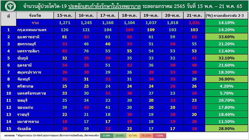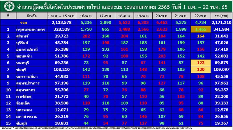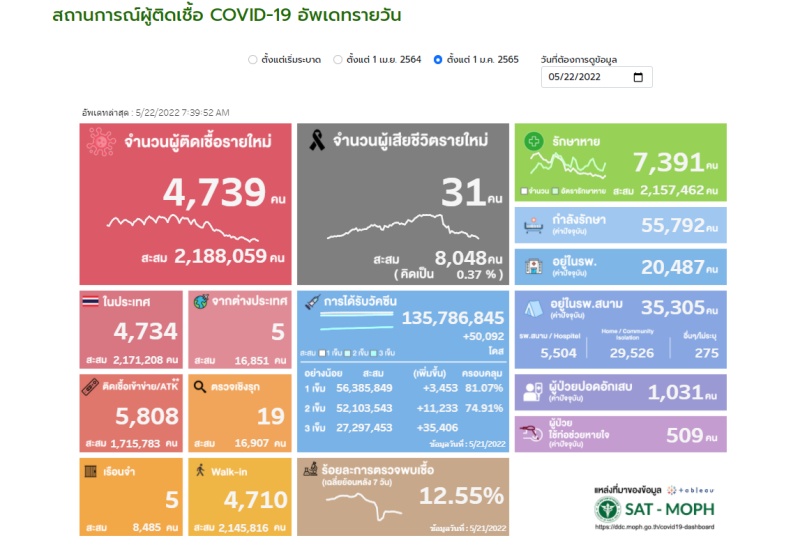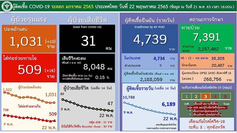 อนึ่ง เมื่อเวลา 08.30 น.สำนักข่าวอิศรา (www.isranews.org) รายงานสถานการณ์การติดเชื้อไวรัสโควิด-19 ประจำวันที่ 22 พ.ค. ว่าในวันนี้มีผู้ติดเชื้อใหม่ทั้งสิ้น 4,739 ราย ส่งผลทำให้มีผู้ติดเชื้อใหม่นั้บตั้งแต่ปี 2565 ทั้งสิ้น 2,188,059 ราย โดยแบ่งออกเป็นผู้ติดเชื้อใหม่ในประเทศ 4,734 ราย ติดเชื้อจากต่างประเทศ 5 ราย มีผู้เสียชีวิตรายใหม่ 31 ราย ทำให้มีผู้เสียชีวิตสะสมตั้งแต่ต้นปี 65 อยู่ที่ 8,048 ราย ขณะที่มีผู้ติดเชื้อเข้าข่ายหรือ ATK 5,808 ราย สำหรับรายละเอียดผู้เสียชีวิตนั้น เป็น ผุ้ป่วยโรคเรื้อรัง 28 ราย เป็นผู้ป่วยติดเตียง 4 ราย เป็นผู้ป่วยกลุ่ม608 จำนวน 31 ราย(ร้อยละ100) เป็นผู้ที่ยังไม่ได้รับวัคซีนครบสองเข็ม18ราย ได้รับวัคซีน 1 เข็ม 1 ราย เป็นผู้ที่ได้รับวัคซีนสองเข็มครบ 11 ราย แบ่งออกเป็นเข็มสองเกิน 3 เดือน 9 ราย และเข็มสองไม่เกิน 3 เดือน 2 ราย รับวัคซีนเข็มสามแต่เสียชีวิต จากโควิด 1 ราย