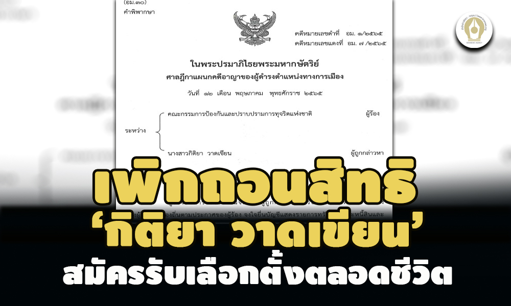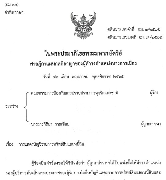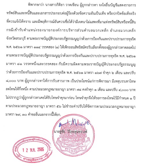 พิพากษาว่า นางสาวกิติยา วาดเขียน ผู้ถูกกล่าวหา จงใจยื่นบัญชีแสดงรายการทรัพย์สินและหนี้สินและเอกสารประกอบต่อผู้ร้องด้วยข้อความอันเป็นเท็จหรือปกปิดข้อเท็จจริงที่ควรแจ้งให้ทราบและมีพฤติการณ์อันควรเชื่อได้ว่ามีเจตนาไม่แสดงที่มาแห่งทรัพย์สินหรือหนี้สิน กรณีเข้ารับตําแหน่งรองนายกองค์การบริหารส่วนตําบลมวกเหล็ก อําเภอมวกเหล็ก จังหวัดสระบุรี ตามพระราชบัญญัติประกอบรัฐธรรมนูญว่าด้วยการป้องกันและปราบปรามการทุจริต พ.ศ. 2561 มาตรา 114 วรรคสอง (1) ให้เพิกถอนสิทธิสมัครรับเลือกตั้งของผู้ถูกกล่าวหาตลอดไป ตามพระราชบัญญัติประกอบรัฐธรรมนูญว่าด้วยการป้องกันและปราบปรามการทุจริต พ.ศ. 2561 มาตรา 81 วรรคหนึ่งและวรรคสอง กับมีความผิดตามพระราชบัญญัติประกอบรัฐธรรมนูญ ว่าด้วยการป้องกันและปราบปรามการทุจริต พ.ศ. 2561 มาตรา 167 จําคุก 2 เดือน และปรับ 8,000 บาท ผู้ถูกกล่าวหาให้การรับสารภาพ เป็นประโยชน์แก่การพิจารณา มีเหตุบรรเทาโทษ ลดโทษให้กึ่งหนึ่ง ตามประมวลกฎหมายอาญา มาตรา 78 คงจําคุก 1 เดือน และปรับ 4,000 บาท ไม่ปรากฏว่าผู้ถูกกล่าวหาเคยได้รับโทษจําคุกมาก่อน โทษจําคุกจึงให้รอการลงโทษไว้มีกําหนด 1 ปี ตามประมวลกฎหมายอาญา มาตรา 56 ไม่ชําระค่าปรับให้จัดการตามประมวลกฎหมายอาญา มาตรา 29, 30 คําขออื่นนอกจากนี้ให้ยก (คดีหมายเลขแดงที่ อม.7/2565 วันที่ 12 พฤษภาคม 2565)