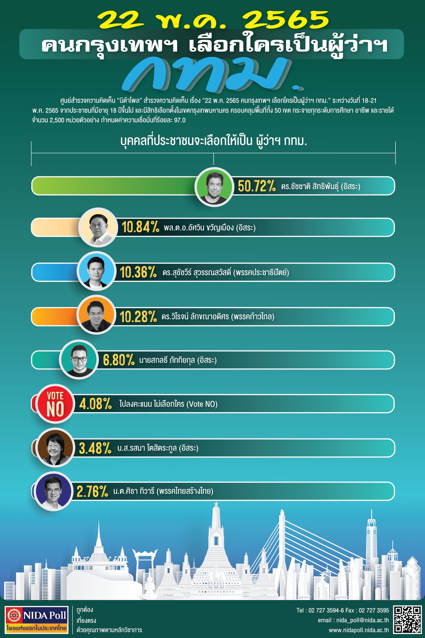 ผู้สื่อข่าวรายงานว่า เมื่อวันที่ 22 พ.ค.2565 ศูนย์สำรวจความคิดเห็นนิด้าโพล สถาบันบัณฑิตพัฒนบริหารศาสตร์ (นิด้า) เปิดเผยผลสำรวจของประชาชน เรื่อง '22 พ.ค. 2565 คนกรุงเทพฯ เลือกใครเป็นผู้ว่าฯ กทม.' ทำการสำรวจระหว่างวันที่ 18-21 พ.ค.2565 จากประชาชนที่มีอายุ 18 ปีขึ้นไป และมีสิทธิเลือกตั้งในกรุงเทพมหานคร ครอบคลุมพื้นที่ทั้ง 50 เขต กระจายทุกระดับการศึกษา อาชีพ และรายได้ รวมทั้งสิ้น จำนวน 2,500 หน่วยตัวอย่าง