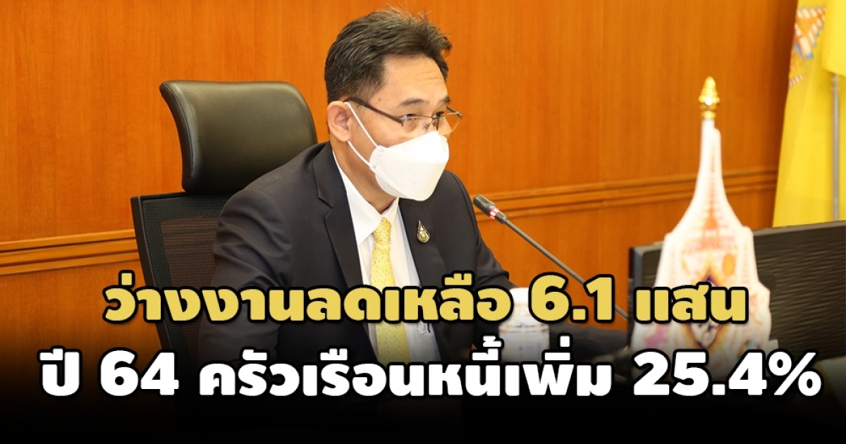 ‘สศช.’ เผยไตรมาส 1/65 การจ้างงานเพิ่มขึ้น 3% แตะ 38.7 ล้านคน ขณะที่อัตราว่างงานอยู่ที่ 1.53% ต่ำสุดนับตั้งแต่เกิดโควิด พร้อมระบุปี 64 ครัวเรือนมีหนี้สินเพิ่มขึ้น 25.4% สวนทางรายได้เติบโตเพียง 5.1%