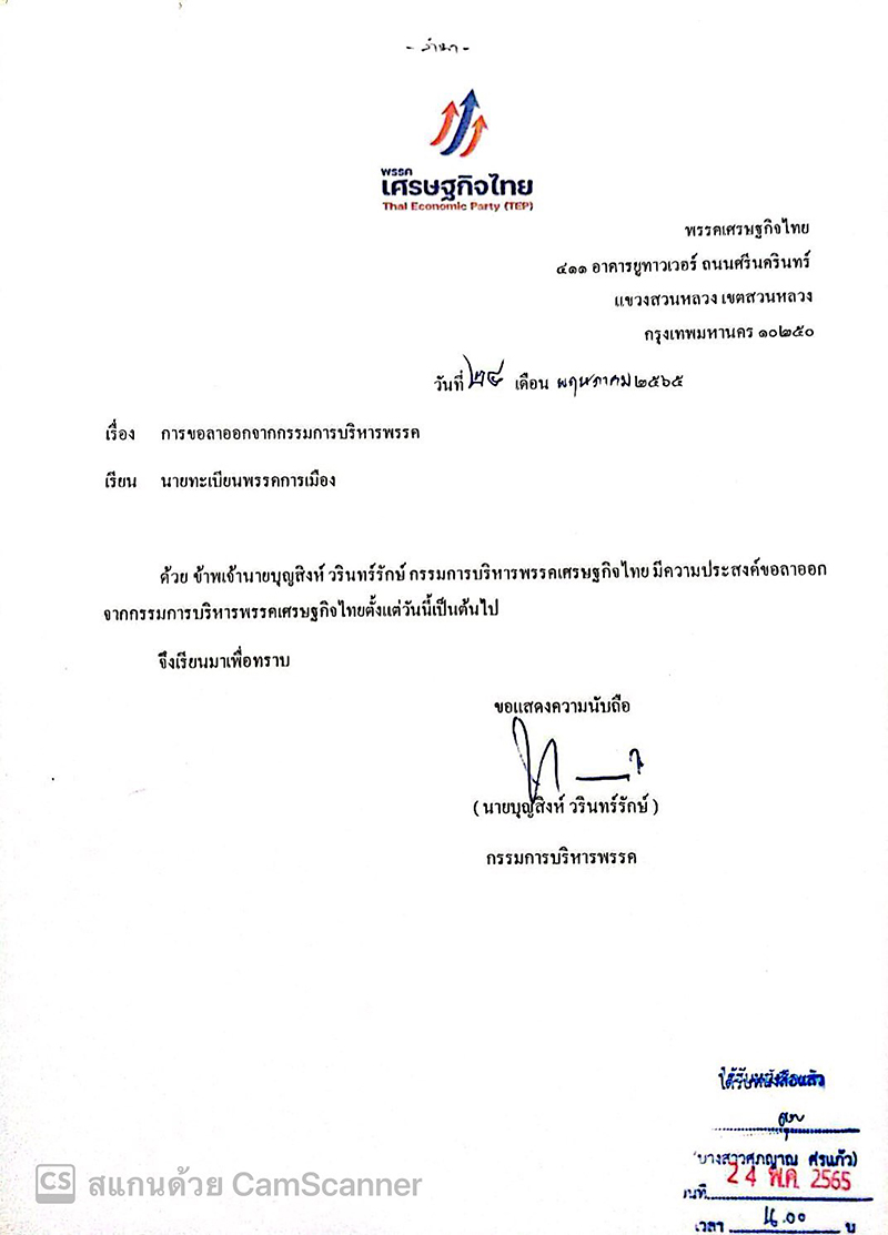 ก่อนหน้านี้ นายบุญสิงห์ วรินทร์รักษ์ สมาชิกสภาผู้แทนราษฎรแบบบัญชีรายชื่อ และนายทะเบียนพรรคเศรษฐกิจไทย ในฐานะกรรมการบริหารพรรค เปิดเผยว่า หลังจากได้เกิดข่าวความขัดแย้งขึ้นภายในพรรคที่ปรากฏต่อสื่อมวลชน กรรมการบริหารพรรคจำนวน 15 คนได้ยื่นหนังสือลาออกลงวันที่ 24 พ.ค.2565 ต่อนายทะเบียนพรรคการมืองและนำรายงานต่อคณะกรรมการการเลือกตั้ง (กกต.) รับทราบแล้วนั้น
