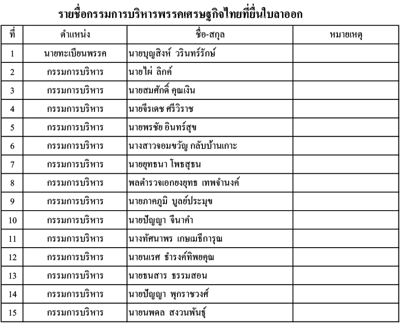 ผู้สื่อข่าวรายงานว่า สำหรับกรรมการบริหารพรรค 15 คนที่ยื่นลาออก ประกอบด้วย 1.นายบุญสิงห์ วรินทร์รักษ์ 2.นายไผ่ ลิกค์ 3.นายสมศักดิ์ คุณเงิน 4.นายจีรเดช ศรีวิราช 5.นายพรชัย อินทร์สุข 6.น.ส.จอมขวัญ กลับบ้านเกาะ 7.นายยุทธนา โพธสุธน