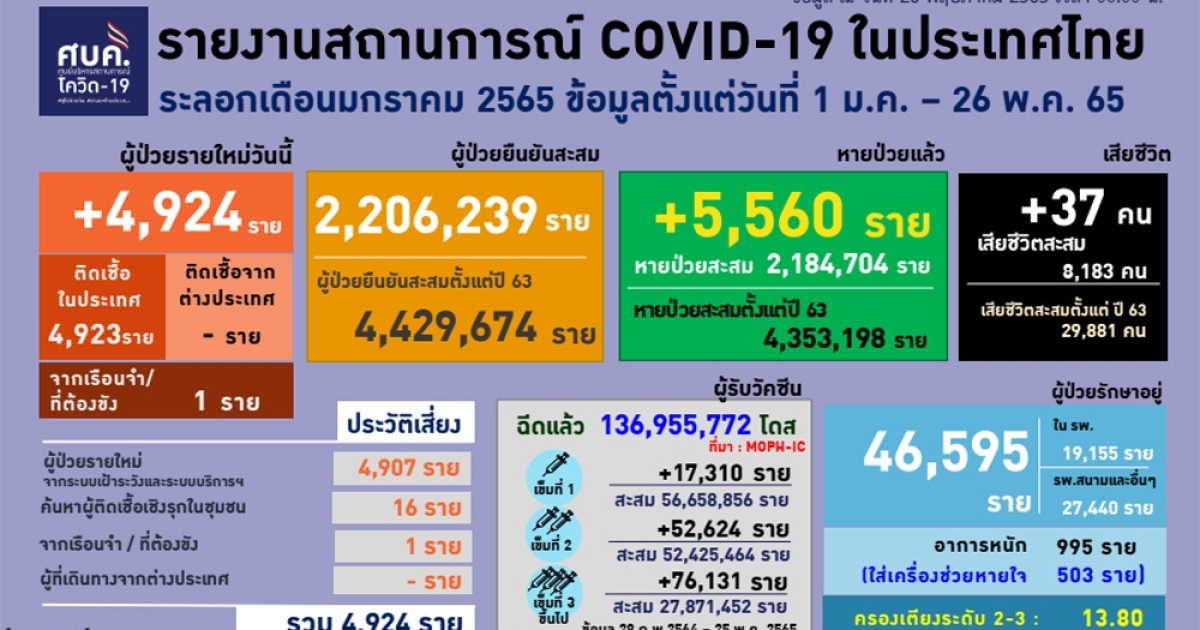 สำนักข่าวอิศรา (www.isranews.org) รายงานว่า เมื่อวันที่ 26 พ.ค. 2565 ศูนย์บริหารสถาการณ์โควิด-19 (ศบค.) รายงานสถานการณ์ประจำวัน โดยพบผู้ป่วยรายใหม่ 4,924 ราย จำแนกเป็น ติดเชื้อในประเทศ 4,923 ราย เกิดจากระบบเฝ้าระวังและระบบบริการฯ 4,907 ราย เกิดจากการค้นหาเชิงรุกและพบการติดเชื้อในชุมชน 16 ราย ติดเชื้อภายในเรือนจำ 1 ราย ไม่มีผู้ติดเชื้อเดินทางกลับมาจากต่างประเทศ รวมผู้ป่วยสะสม 4,429,674 ราย