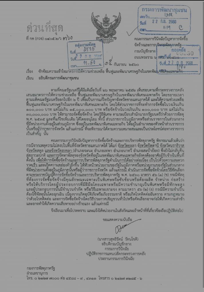 ต่อมาในช่วงเดือนกันยายน 2560 คณะกรรมการวินิจฉัยปัญหาการจัดซื้อจัตจ้างและการบริหารพัสดุภาครัฐ ได้มีพิจารณาแล้วเห็นว่า กรณีจากเหตุความไม่สงบในพื้นที่จังหวัดชายแดนภาคใต้ ได้แก่ จังหวัดยะลา จังหวัดปัตตานี จังหวัดนราธิวาส จังหวัดสตูล และจังหวัดสงขลา (อำเภอจะนะ อำเภอเทพา อำเภอนาทวี อำเภอสะบ้าย้อย) ซึ่งยังไม่กลับคืนสู่สภาวะปกติ และการจัดหาพัสดุของจังหวัดที่อยู่ในเขตพัฒนาพิเศษเฉพาะกิจยังคงต้องอาศัยผู้รับจ้างในพื้นที่