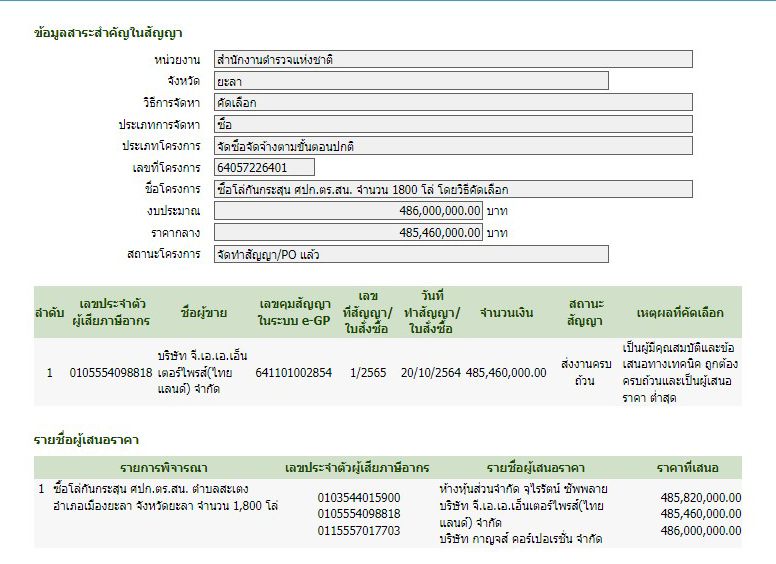 กรณีสำนักข่าวอิศรา (www.isranews.org) ตรวจสอบพบว่า ในช่วงเดือนกรกฎาคม 2564 สำนักงานตำรวจแห่งชาติ (ตร.) ได้ประกาศรายชื่อผู้ชนะการเสนอราคาซื้อโล่กันกระสุน ศปก.ตร.สน. ตำบลสะเตง อำเภอเมืองยะลา จังหวัดยะลา จำนวน 1,800 โล่ วิธีคัดเลือก คือ บริษัท จี.เอ.เอ.เอ็นเตอร์ไพรส์(ไทยแลนด์) จำกัด โดยเสนอราคาเป็นเงินทั้งสิ้น 485,460,000 บาท ขณะที่ในขั้นตอนการจัดซื้อจัดจ้างพบว่า มีผู้รับ/ซื้อซอง และเสนอราคาแข่งขันงาน จำนวน 3 ราย คือ ห้างหุ้นส่วนจำกัด จุไรรัตน์ ซัพพลาย เสนอราคา 485,820,000 บาท บริษัท จี.เอ.เอ.เอ็นเตอร์ไพรส์(ไทยแลนด์) จำกัด 485,460,000 บาท และบริษัท กาญจส์ คอร์เปอเรชั่น จำกัด 486,000,000 บาท