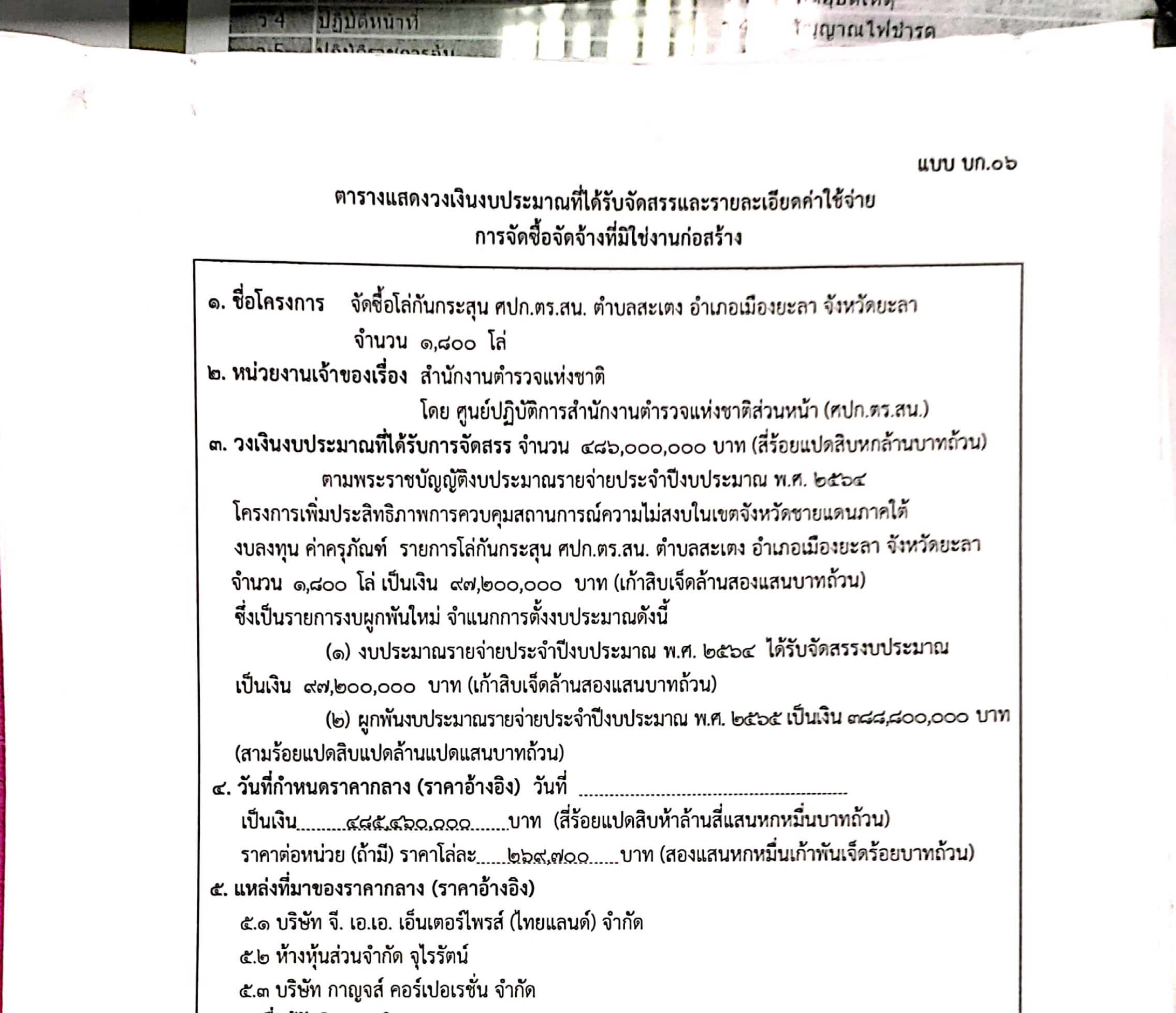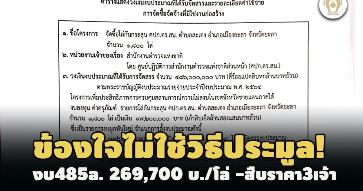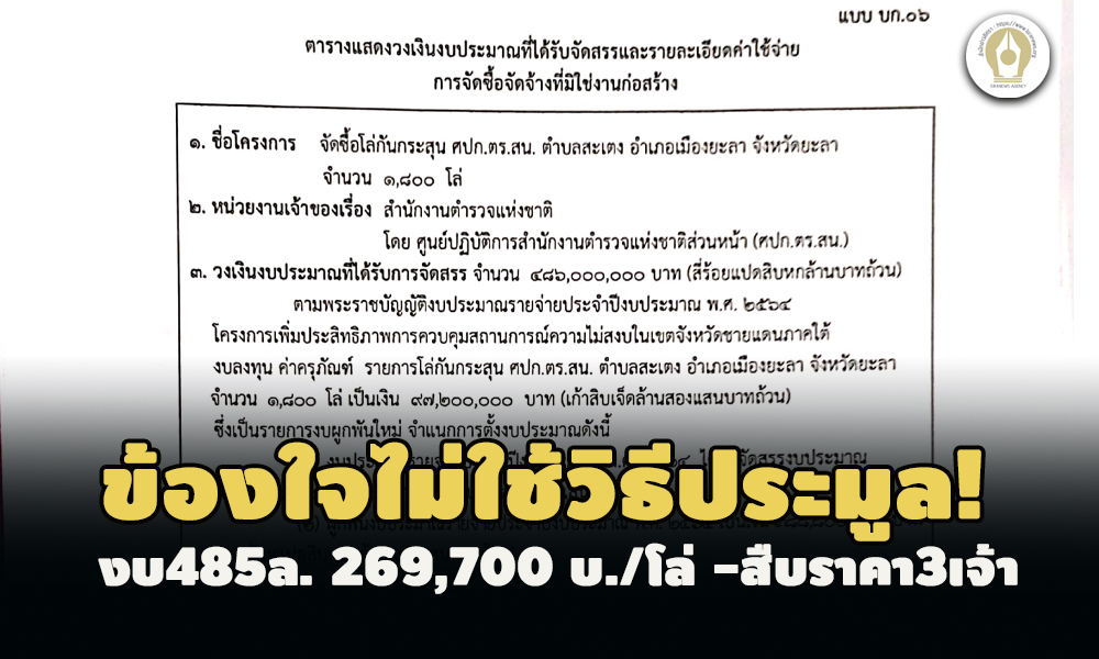 เจาะไส้ใน ตร.จัดซื้อโล่กันกระสุน ศปก.ตร.สน.ยะลา 1,800 อัน 485 ล. เฉลี่ยของ 269,700 บ./โล่ สืบราคากลางเอกชน 3 เจ้า ผู้ชนะแข่งงานเท่าราคากลางเป๊ะ-ข้องใจไม่ใช้วิธีประมูล