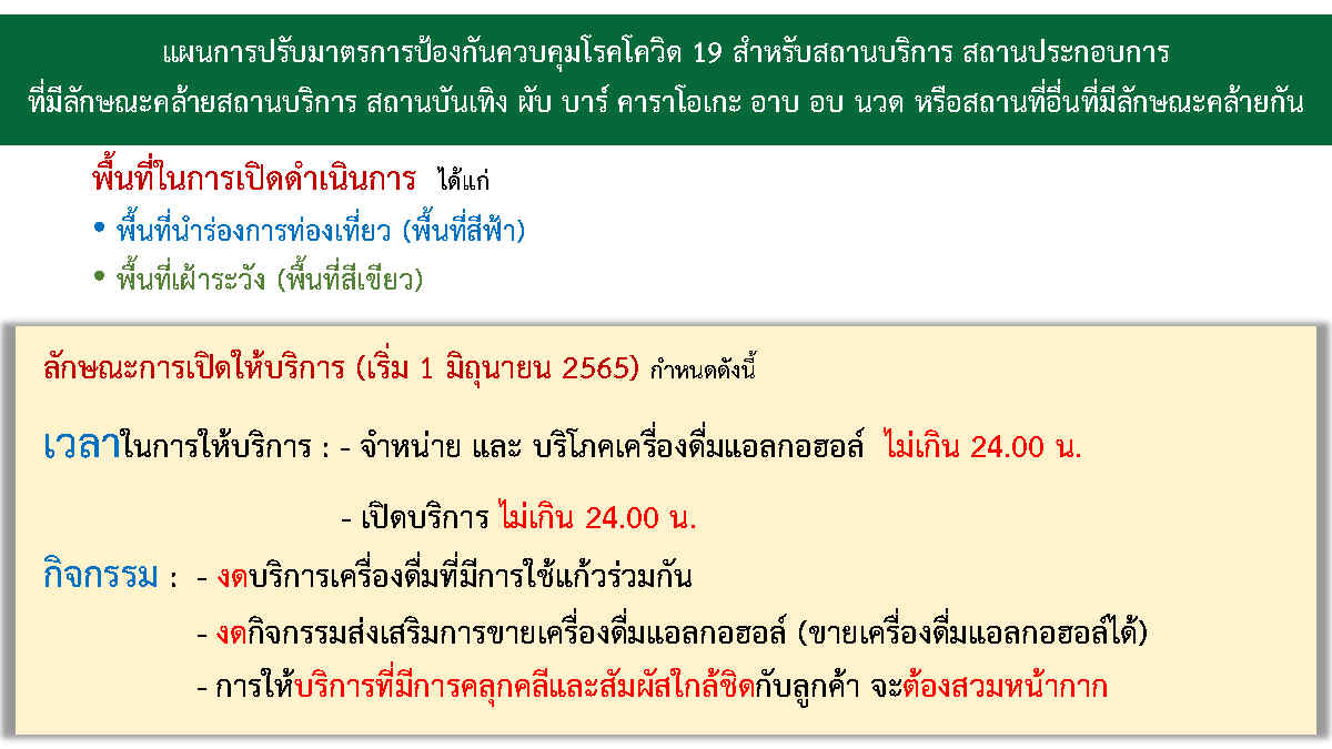 “จากนี้ในพื้นที่สีฟ้า สีเขียว ถือว่าท่านเปิดให้บริการได้อย่างถูกต้อง และเป็นทางการก็ว่าได้ แต่ขอความร่วมมือผู้ประกอบการให้เห็นใจ ศบค. ด้วย ทั้งตัวท่าน และพนักงานของท่านต้องปลอดภัย มาตรการที่สำคัญที่ศบค.ระบุคือ พนักงาน นักร้อง นักดนตรี ต้องได้รับวัคซีนเข็ม 3 ทั้งหมดร้อยละ 100 และให้ประเมินบุคลากรของท่านผ่านทาง Thai Save Thai ทุกวัน ส่วนประชาชนที่ใช้บริการเองก็ต้องเห็นใจด้วย กรณีที่มีความเสี่ยง มีโรคประจำตัว ขอให้ใจเย็นๆ ในตอนนี้เพิ่งเริ่มเปิดถือว่ายังมีความเสี่ยงอยู่ เพื่อให้การขับเคลื่อนเศรษฐกิจเดินหน้าไม่สะดุด” พญ.อภิสมัย กล่าว