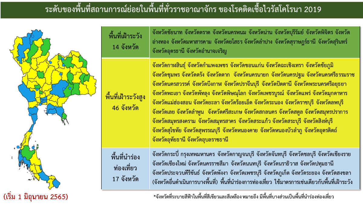 สำหรับจังหวัดที่มีผู้ติดเชื้อเกิน 100 คน ได้แก่ กทม. บุรีรัมย์ นนทบุรี และสมุทรสาคร โดยพื้นที่ๆ มีผู้ติดเชื้อสูงสุดยังคงเป็น กทม. ทั้งนี้ ในวันที่ 1 มิ.ย. จะมีการผ่อนคลายมาตรการ คือ การให้สถานบริการ สถานประกอบการคล้าสถานบันเทิง ผับบาร์ คาราโอเกะ อาบอบนวด ฯลฯ สามารถผ่อนปรนเปิดบริการได้ แต่จะจำกัดเวลาให้บริการได้ไม่เกิย 24.00 น. และมีการระบุรายละเอียดงดกิจกรรมส่งเสริมการขาย และให้บริการใกล้ชิดจะต้องสวมหน้ากากอนามัย