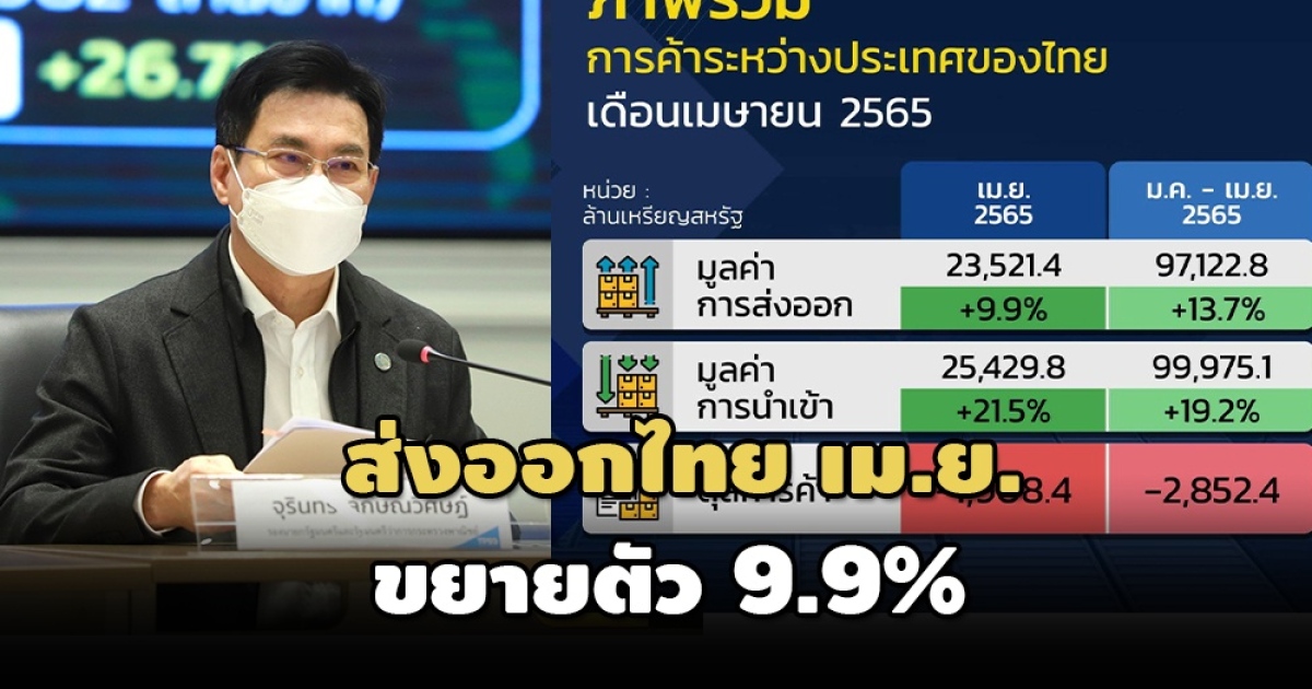 เมื่อวันที่ 27 พ.ค. นายจุรินทร์ ลักษณวิศิษฏ์ รองนายกรัฐมนตรีและ รมว.พาณิชย์ แถลงภาวะการค้าระหว่างประเทศของไทย เดือน เม.ย.2565 ว่า การส่งออกไทยเดือน เม.ย.2565 มีมูลค่า 23,521.4 ล้านดอลลาร์สหรัฐ ขยายตัว 9.9% เมื่อเทียบกับช่วงเดียวกันของปีก่อน ส่วนการนำเข้า มีมูลค่า 25,429.8 ล้านดอลลาร์ ขยายตัว 21.5% เมื่อเทียบกับช่วงเดียวกันของปีก่อน ส่งผลให้ในเดือน เม.ย.2565 ไทยขาดดุลการค้า 1,908.4 ล้านดอลลาร์สหรัฐ
