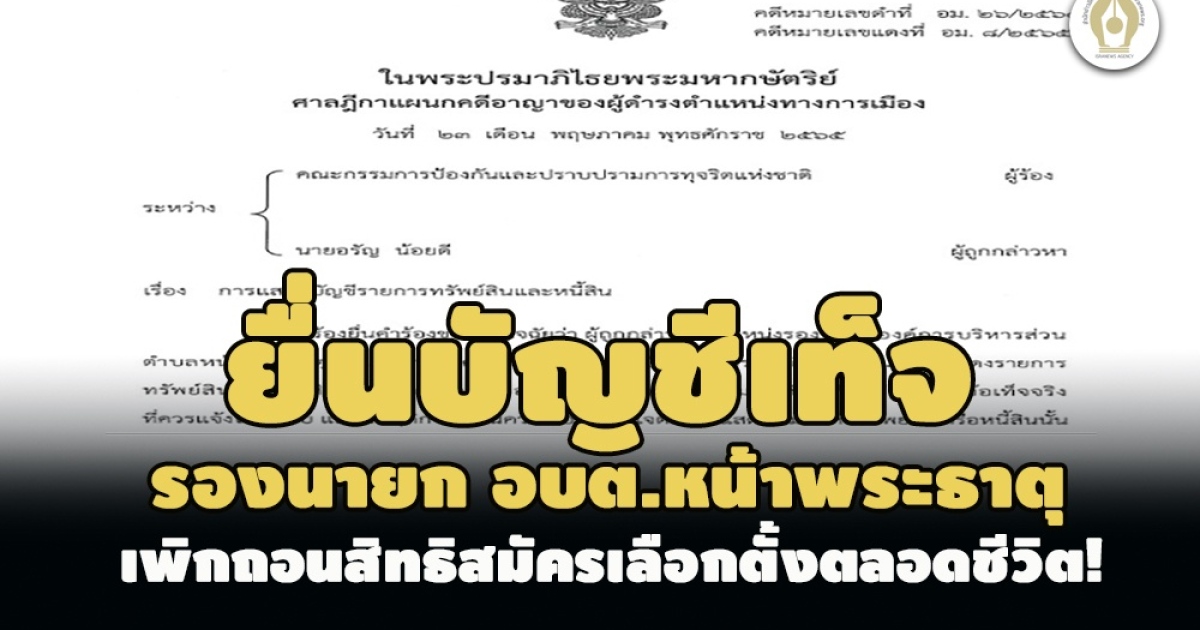 - ศาลฎีกาฯห้ามดำรงตำแหน่งการเมืองตลอดชีวิต นายก อบต.หนองปลิง ยื่นบัญชีฯเท็จ ป.ป.ช.