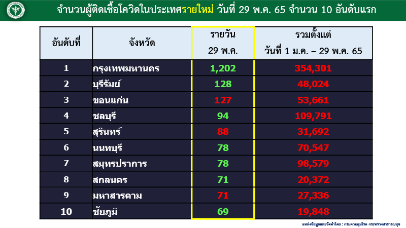 สำหรับ 10 จังหวัดที่มีผู้ติดเชื้อโควิดรายใหม่สูงสุด ตามลำดับ ได้แก่ กทม. 1,202 ราย บุรีรัมย์ 128 ราย ขอนแก่น 127 ราย ชลบุรี 94 ราย สุรินทร์ 88 ราย นนทบุรี 78 ราย สมุทรปราการ 78 ราย สกลนคร 71 ราย มหาสารคาม 71 ราย ชัยภูมิ 69 ราย