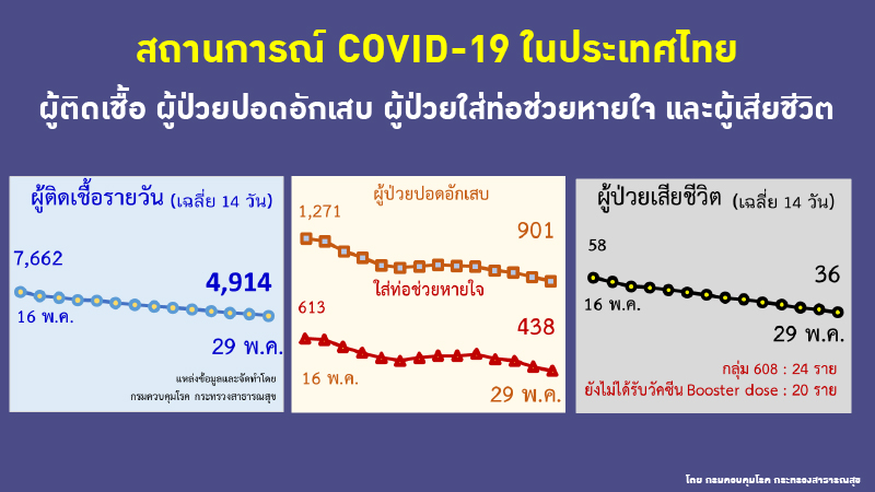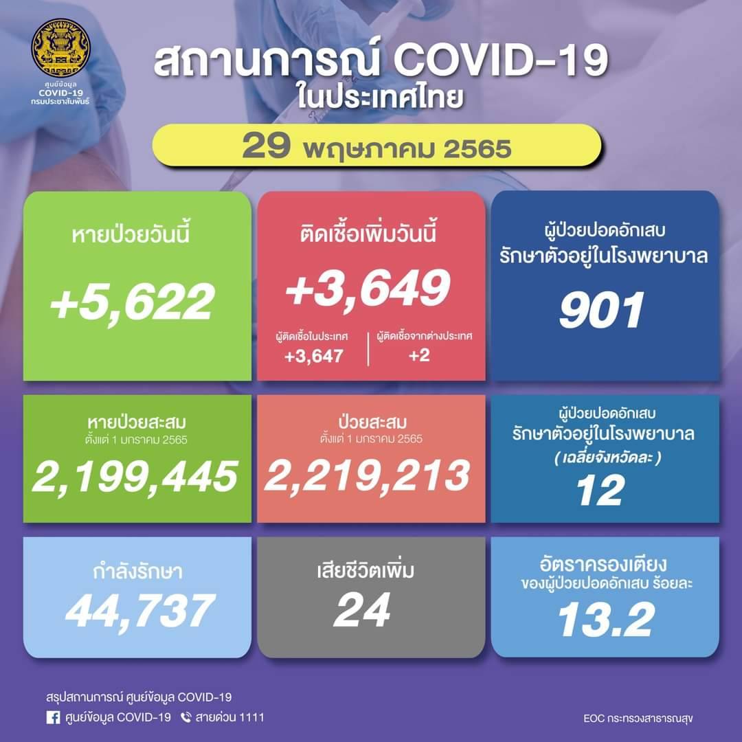 อนึ่งเวลา 08.00 น.สำนักข่าวอิศรา (www.isranews.org) รายงานสถานการณ์การติดเชื้อไวรัสโควิด-19 ประเทศไทย ประจำวันที่ 29 พฤษภาคม 2565 ว่า มีผู้ติดเชื้อใหม่ 3,649 ราย