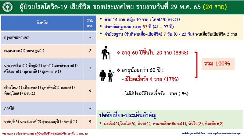 ด้านผู้เสียชีวิต 24 ราย มาจาก ปริมณฑล 2 ราย ภาคตะวันออกเฉียงเหนือ 7 ราย ภาคเหนือ 6 ราย และภาคกลาง 9 ราย แบ่งเป็นชาย 14 ราย หญิง 10 ราย เป็นกลุ่ม 608 คิดเป็น 100% จำแนกเป็น ผู้มีอายุมากกว่า 60 ปี 20 ราย คิดเป็น 83% ป่วยเรื้อรัง 4 ราย คิดเป็น 17%