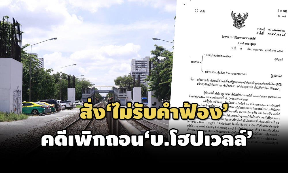 เมื่อวันที่ 30 พ.ค. ศาลปกครองสูงสุดมีคำสั่งยืนตามคำสั่งของศาลปกครองชั้นต้น ไม่รับคำฟ้องไว้พิจารณา และให้จำหน่ายคดีออกจากสารบบความ ในคดีที่การรถไฟแห่งประเทศไทย (รฟท.) ยื่นฟ้องนายทะเบียนหุ้นส่วนบริษัทกรุงเทพมหานคร เพื่อขอให้เพิกถอนการรับจดทะเบียนบริษัท โฮปเวลล์ (ประเทศไทย) จำกัด เนื่องจากศาลฯพิเคราะห์แล้วเห็นว่า การยื่นฟ้องคดีเป็นเวลาเกินกว่า 90 วัน แห่งการฟ้องคดีมาตรา 49 แห่ง พ.ร.บ.จัดตั้งศาลปกครองและวิธีพิจารณาคดีทางปกครอง พ.ศ.2542