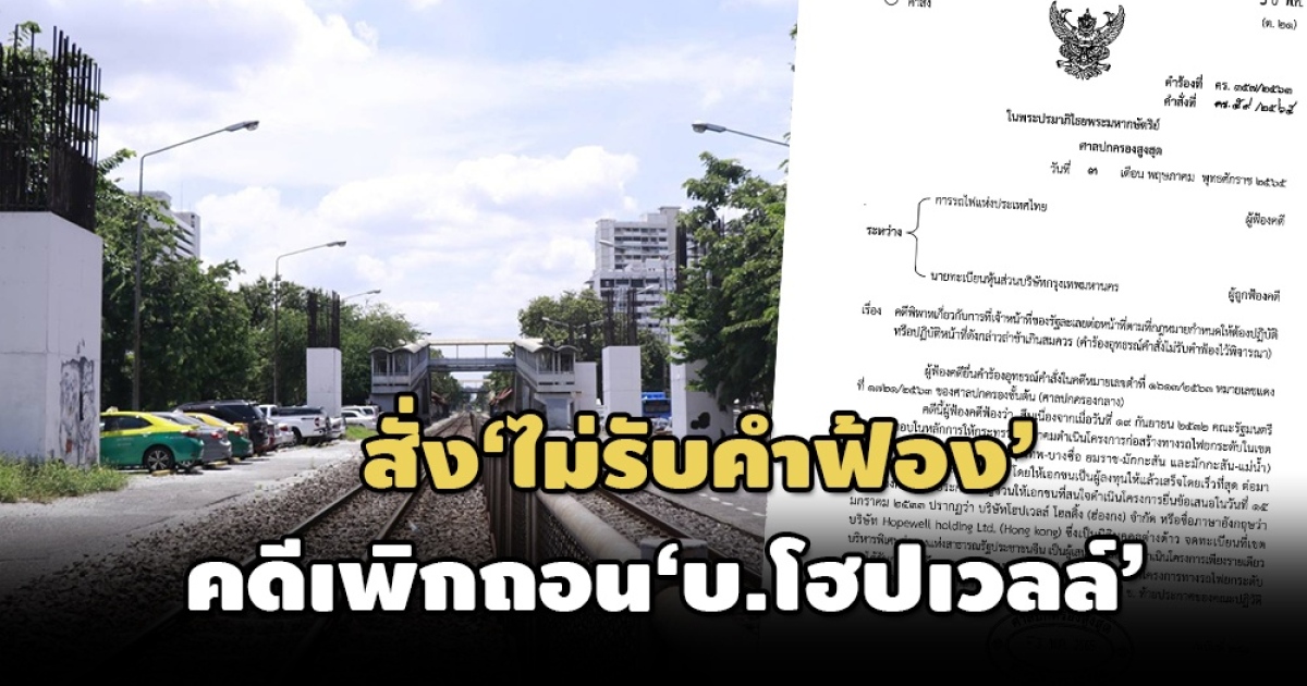'ศาลปกครองสูงสุด' มีคำสั่งยืน ‘ไม่รับคำฟ้องไว้พิจารณา’ คดี ‘รฟท.’ ฟ้องเพิกถอนการจดทะเบียน ‘บ.โฮปเวลล์’ เหตุยื่นฟ้องคดีเกินเวลา 90 วัน-ไม่เกี่ยวกับการคุ้มครองประโยชน์สาธารณะ