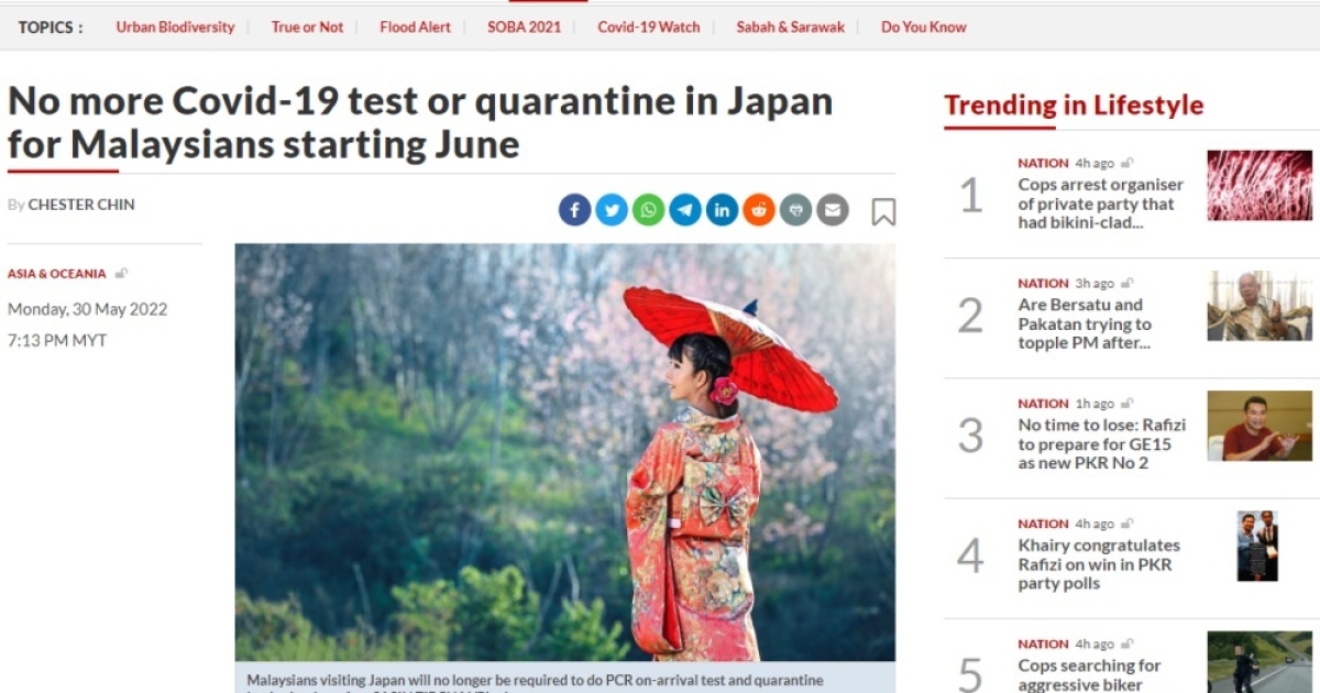 สำนักข่าวอิศรา (www.isranews.org) รายงานสถานการณ์การระบาดของไวรัสโควิด-19 หรือโคโรน่าไวรัสว่า ประเทศญี่ปุ่นนั้นได้มีการกำหนนดหลักเกณฑ์สำหรับการท่องเที่ยวเพิ่มเติมว่านับตั้งแต่ 1 มิ.ย. เป็นต้นไป ชาวมาเลเซียนั้นจะไม่ต้องเข้ารับการตรวจหาเชื้อโควิดแบบพีซีอาร์แล้วเมื่อเดินทางมาถึงประเทศญี่ปุ่น ตามแถลงการณ์ขององค์การการท่องเที่ยวแห่งชาติญี่ปุ่น (JNTO)