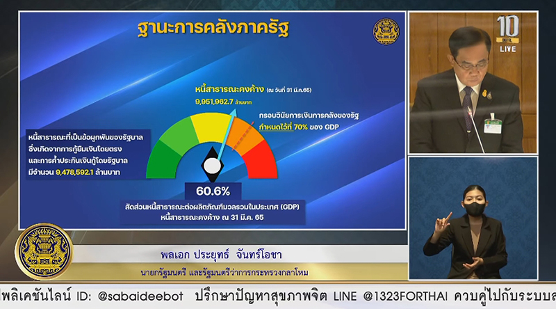 สำหรับฐานะการคลัง หนี้สาธารณะคงค้าง ณ วันที่ 31 มี.ค.2565 มีจำนวน 9,951,962.7 ล้านบาท คิดเป็น 60.6% ของจีดีพี อยู่ภายใต้กรอบการบริหารนี้สาธารณะตามกฎหมายที่กำหนดไว้ 70% โดยหนี้สาธารณะที่เป็นข้อผูกพันของรัฐบาลซึ่งเกิดจากการกู้ยืมเงินโดยตรงและการค้ำประกันเงินกู้โดยรัฐบาล มีจำนวน 9,478,592.1 ล้านบาท สถานะเงินคงคลัง ณ วันที่ 30 เม.ย.2565 มีจำนวน 398,825.2 ล้านบาท รัฐบาลจะบริหารให้อยู่ในระดับเหมาะสมและบริหารรายรับรายจ่ายให้มีประสิทธิภาพและเกิดประโยชน์สูงสุด
