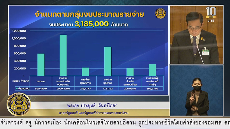 ต่อมา พล.อ.ประยุทธ์ ชี้แจงว่า งบลงทุน 6.9 แสนล้านบาทหรือ 21.8% ของวงเงินงบประมาณ เป็นไปตามกฎหมาย นอกจากนี้ภาครัฐยังลงทุนในส่วนอื่นๆ อีกด้วย เช่น เงินกู้ การร่วมลงทุนระหว่างรัฐกับเอกชน จึงอยากบอกว่างบลงทุนไม่ได้มีแค่เฉพาะในงบประมาณรายจ่ายเท่านั้น