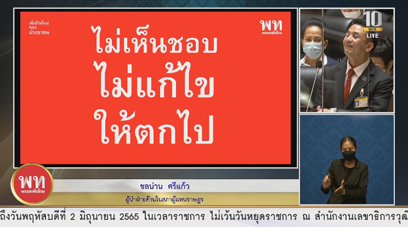นโยบายหลักของรัฐบาลไม่ได้เยอะเหมือนผู้ว่าฯ กทม.คนใหม่ อยากให้ย้อนดูนโยบายพรรคท่านว่าทำได้ตามที่หาเสียงหรือไม่ ยกตัวอย่าง มารดาประชารัฐถ้วนหน้า ทุกวันนี้คนจนถ้วนหน้า ตกงานถ้วนหน้า ธุรกิจเจ๊งถ้วนหน้า ซึ่งก็แอบลุ้นว่าปีสุดท้ายจะมีนโยบายอะไรบ้าง แต่สุดท้ายก็ไม่มีการตั้งงบประมาณอะไรที่ตรงไว้ตามที่หาเสียงไว้แม้แต่ข้อเดียว