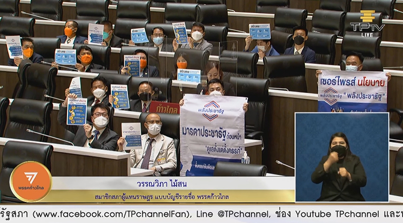 ผู้สื่อข่าวรายงานว่า ในช่วงท้ายของการอภิปราย ส.ส.พรรคก้าวไกล ได้พร้อมใจกันชูภาพนโยบายที่พรรคพลังประชารัฐใช้ในการหาเสียงเลือกตั้งเมื่อปี 2562 โดย น.ส.วรรณวิภา กล่าวด้วยว่า “เพื่อไม่ให้นายกรัฐมนตรีลืมเรื่องเหล่านี้ ดิฉันจึงมีของมาเตือนความจำ เพื่อไม่ให้หลงลืม เพราะป้ายหาเสียงนี้ติดไว้ทุกช่องทางในช่วงที่มีการเลือกตั้ง ก็ได้แต่หวังว่าอย่าได้เอาเรื่องเหล่านี้ไปหลอกลวงประชาชนในการหาเสียงครั้งหน้าอีก