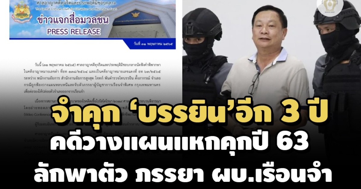 'ศาลอาญาคดีทุจริตฯ' พิพากษา 'บรรยิน' วางแผนแหกคุก ลักพาตัว ผบ.เรือนจำพิเศษเมื่อปี 63 ลงโทษจำคุกอีก 3 ปี ปรับ 50,000 บาท