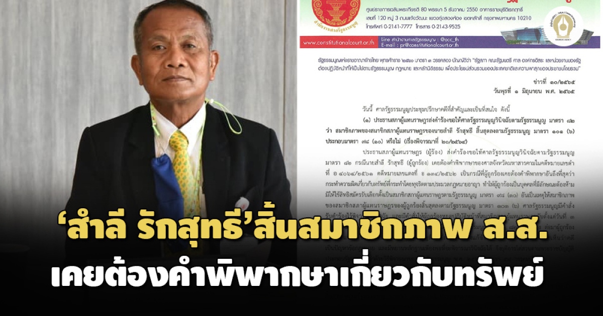 ศาลรัฐธรรมนูญมีมติเอกฉันท์ให้ ‘สำลี รักสุทธี’ สิ้นสมาชิกภาพ ส.ส. เหตุเคยต้องคำพิพากษาอันถึงที่สุดคดีเกี่ยวกับทรัพย์ ให้ประธานสภาผู้แทนราษฎรเลื่อนผู้ที่อยู่ถัดไปในบัญชีรายชื่อเป็น ส.ส.และประกาศในราชกิจจานุเบกษาภายใน 7 วัน