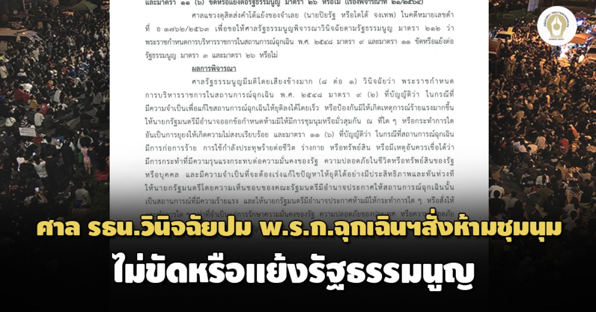 มติศาลรัฐธรรมนูญ 8 ต่อ 1 เสียง วินิจฉัย พ.ร.ก.ฉุกเฉินฯ ให้อำนาจนายกฯ ออกข้อกำหนดห้ามชุมนุมหรือมั่วสุม ไม่ขัดหรือแย้งรัฐธรรมนูญ