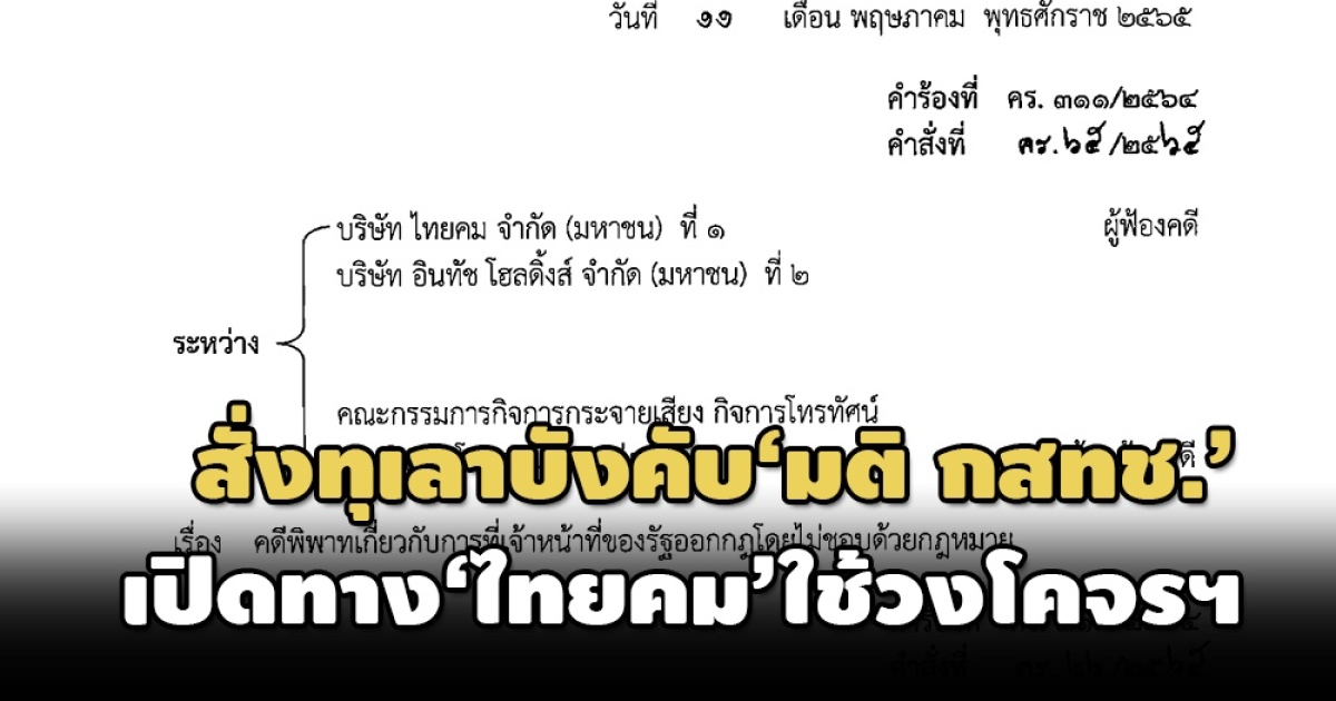 ‘ศาลปกครองสูงสุด’ มีคำสั่งทุเลาการบังคับ ‘มติ กสทช.’ เกี่ยวกับสิทธิในการเข้าใช้วงโคจรดาวเทียมไทยคม 7-8 เปิดทาง ‘บมจ.ไทยคม’ ใช้วงโคจรดาวเทียมไทยคม 7-8 ได้ต่อไป จนกว่าศาลจะมีคำพิพากษา