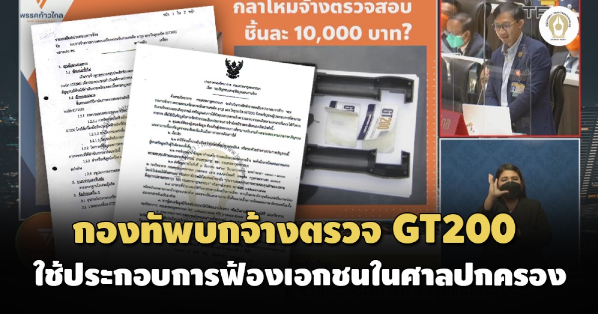 สืบเนื่องจากการอภิปรายระหว่างการพิจารณาร่าง พ.ร.บ.งบประมาณรายจ่ายประจำปีงบประมาณ พ.ศ.2566 ช่วงค่ำวันที่ 2 มิ.ย.2565 ที่ผ่านมา นายจิรัฏฐ์ ทองสุวรรณ์ ส.ส.ฉะเชิงเทรา พรรคก้าวไกล อภิปรายตั้งข้อสังเกตถึงการใช้งบประมาณกระทรวงกลาโหมที่ไม่ปรากฏในเอกสารงบประมาณ ระบุว่า ช่วงปลายเดือน มี.ค.ที่ผ่านมา กองทัพบกทำสัญญาจ้าง มูลค่ารวม 7,570,000 บาท ให้สำนักงานพัฒนาวิทยาศาสตร์และเทคโนโลยีแห่งชาติ (สวทช.) ไปตรวจสอบเครื่องตรวจจับวัตถุระเบิด GT200 จำนวน 757 เครื่อง ตกเครื่องละ 10,000 บาท ตามที่เป็นข่าวไปก่อนหน้านี้