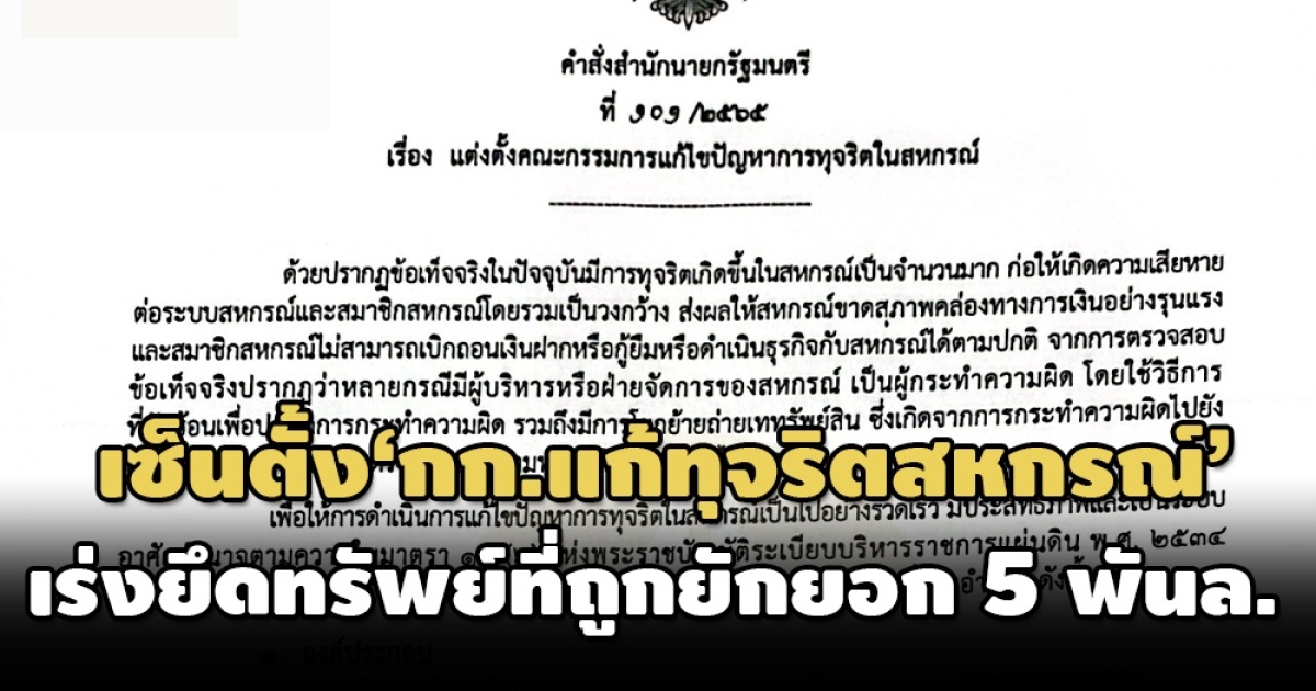นายกฯ เซ็นคำสั่งแต่งตั้ง ‘คณะกรรมการแก้ไขปัญหาการทุจริตในสหกรณ์’ ดึง ‘ตำรวจ-ดีเอสไอ-ปปง.’ ร่วมติดตามยึดทรัพย์ที่มีการยักยอกไปจากสหกรณ์ต่างๆกว่า 5 พันล้าน กลับคืนมาโดยเร็ว