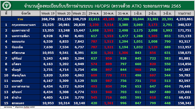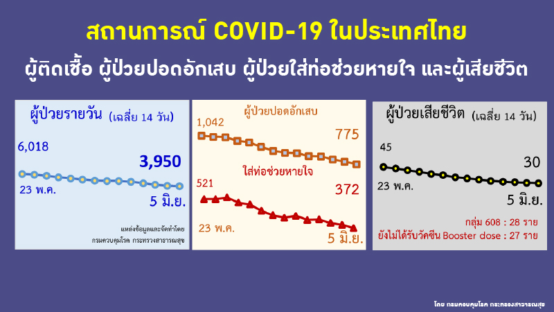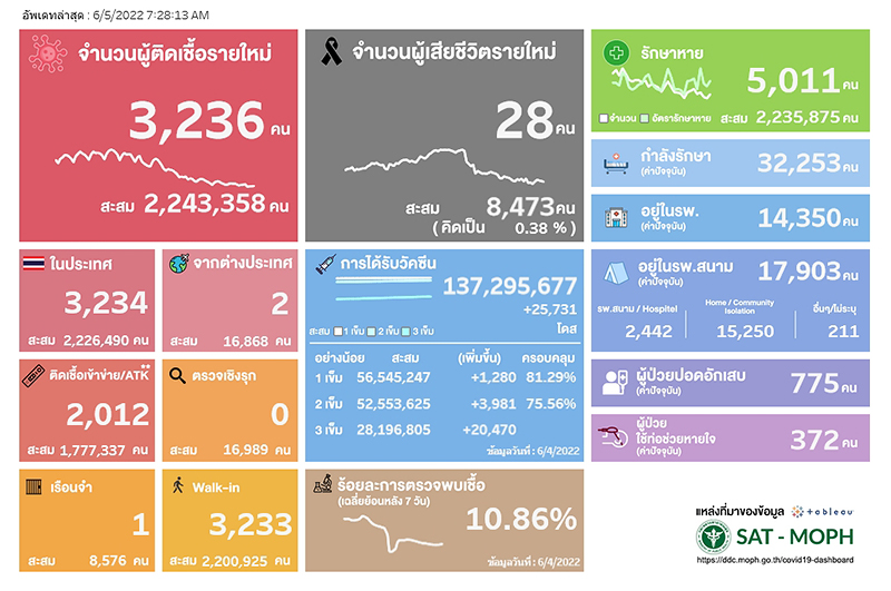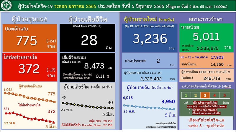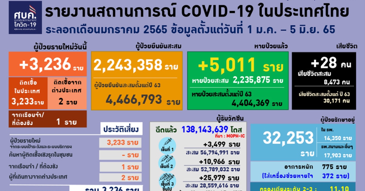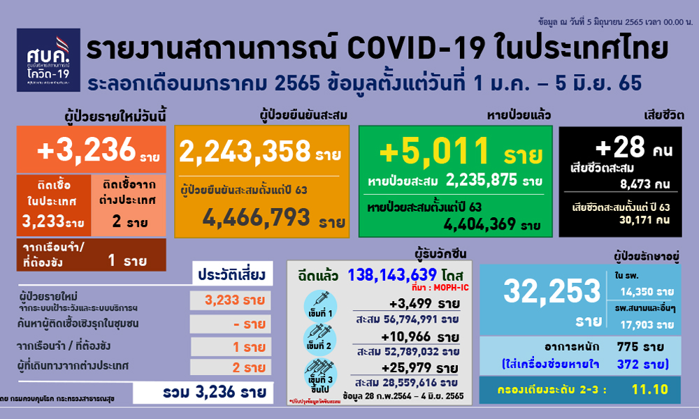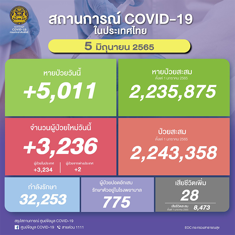 อนึ่งเวลา 08.20 น.สำนักข่าวอิศรา (www.isranews.org) รายงานสถานการณ์การแพร่ระบาดเชื้อไวรัสโควิด -19 ประเทศไทย ประจำวันที่ 5 มิ.ย.2565 ว่า มีผู้ติดเชื้อใหม่ จำนวน 3,236 ราย จำแนกเป็นผู้ป่วยในประเทศทั้ง 3,234 ราย มาจากต่างประเทศ 2 ราย